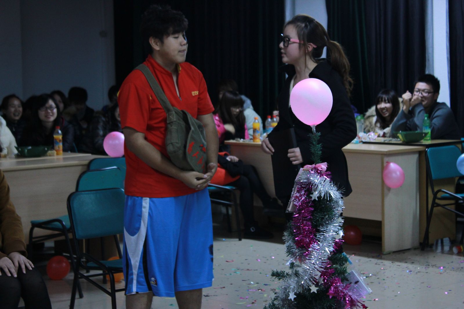 活动伊始,沈老师首先向同学们送上了诚挚的祝福,温馨活泼的话语开启了活动的序幕,让学生们在放松自己的同时感受到学院对他们的关爱。联欢会上,活动形式多样,诗朗诵、独唱、小品等等层出不穷,同学们纷纷用积极的表演回报学院对他们的关怀。趣味游戏“警察小偷”、“萝卜蹲”引得现场同学们笑声连连,纷纷报名参与。活动中,两次发放礼品,更是让同学们感到惊喜。最后,小合唱《朋友》让所有人都情不自禁的跟着音乐节拍唱了起来,联欢会在一片欢声笑语中结束。