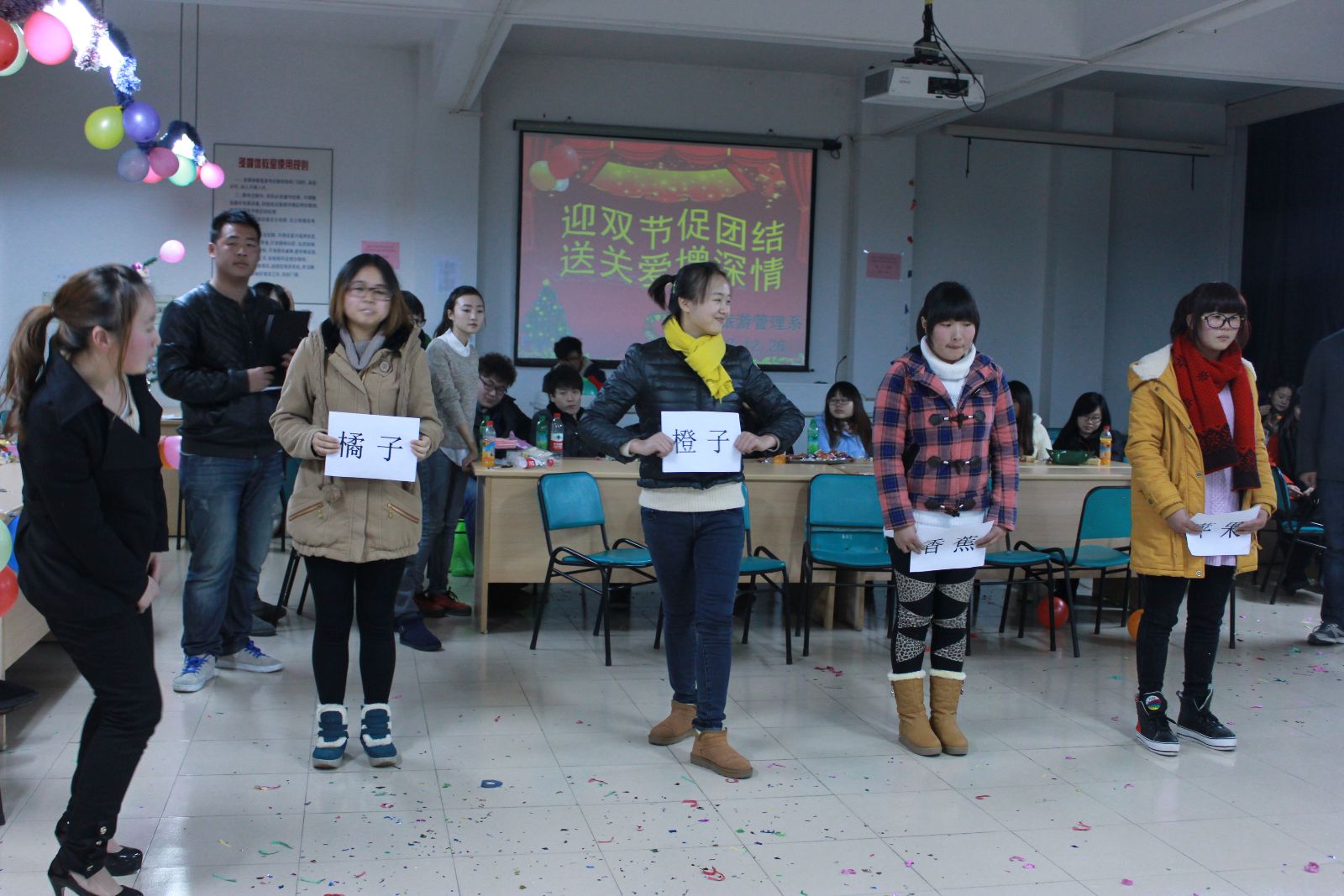 12月27日,商务旅游管理系举办的“迎双节,送关怀”联欢活动在一教202教室举行。党支部书记沈悦老师,辅导员王洋、唐晓英和陆琳老师参加了此次活动,为到场的80多名困难学生代表送上了节日的问候。