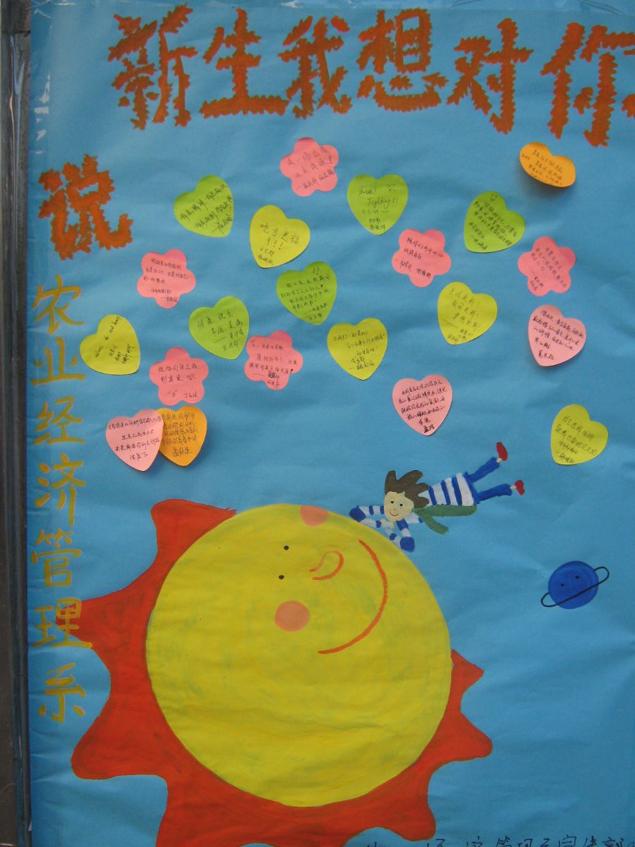 一道道温馨的祝福、一句句温情的寄语道出了学生会干部从学习、生活、娱乐以及社会实践等各方面,对大一新生的殷切展望。作为初到上海农林职业技术学院的大一新生,对很多事情充满着好奇、期望和憧憬,当然也有很多新生不适应集体生活,但是,这只是个新学期的开始,因此我系部这次的宣传活动主要以大一融入集体适应集体为主题,大二学生干部以寄语的方式支持鼓励新生们跨出人生转折点的第一步。