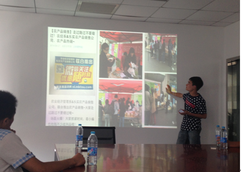 交流会上,叶伟首先介绍了我院农经系乐实农产品营销公司的发展概况,然后详细介绍了乐实农产品营销社团的运作机制。叶伟提到,乐实营销社团是为乐实公司量身定做的学生社团,该社团不再是搞模拟实训、模拟演讲,而是参与销售实实在在的农产品,不但要求社员熟练操作农产品称重、包装、验钞技能,还要求社员熟悉农产品推销技巧、农产品存储知识、农产品保鲜知识。农产品营销社团为学生的发展提供了巨大的舞台,只要想锻炼,学生的团队意识、操作能力,表达能力在这里都能得到提高。社团自今年3月份成立以来,累计参与乐实公司主题销售活动20余次,参与乐实公司日常销售活动64次,社团成员参与各活动累计达624小时,丰富多彩的销售活动大大激发了他们的学习兴趣,提高了他们的职业素质。