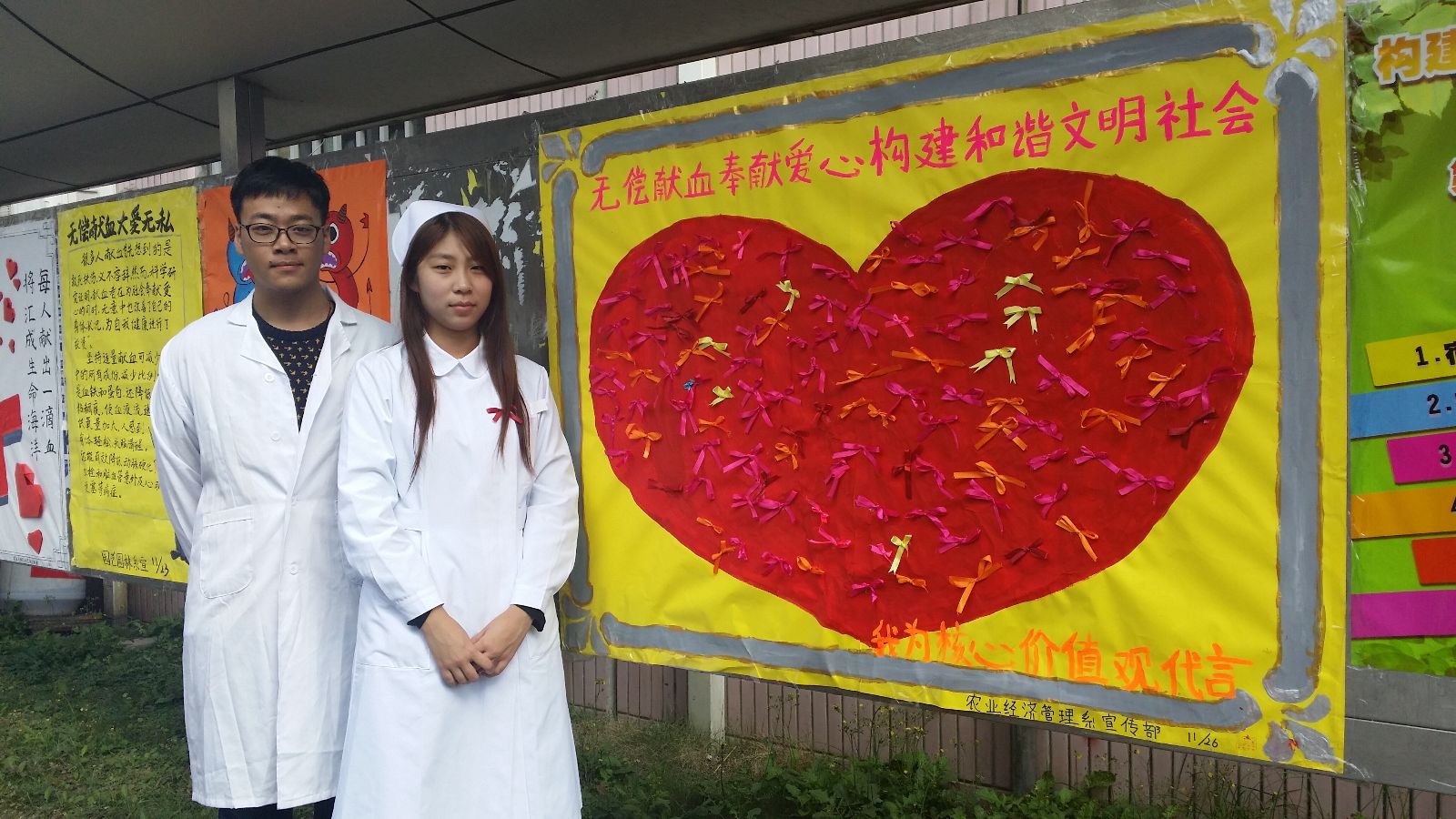 此次宣传的口号是“无偿献血奉献爱心,构建和谐文明社会——我为核心价值观代言”。活动现场,穿着医生服、护士装的工作人员们,为来往的同学们分发多样颜色的丝带,贴在了宣传栏上的“爱心海报”上,形式新颖的宣传活动引来了同学们地踊跃参与,整场活动持续了将近一个半小时,最后“爱心海报”上贴满了同学们的爱心与真情。