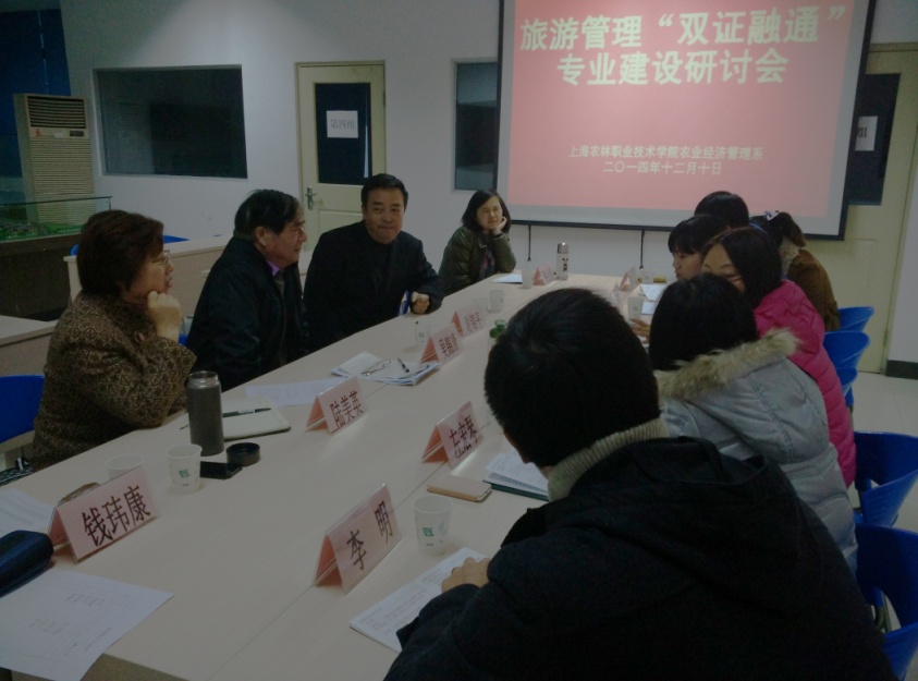 12月10日,农经系召开了旅游管理专业“双证融通”专业建设研讨会,该项目为市教委批复的试点专业建设课题,会议邀请了来自上海交通大学的教育专家吴锦康教授就专业建设方案做了陈述,学院主管教学工作的谢锦平副院长、校外专家陆美英副教授、系部主任高萍、旅游管理专业带头人王桂霞、教研室主任陈晓莉、旅游专业教师及相关人员出席了会议。
