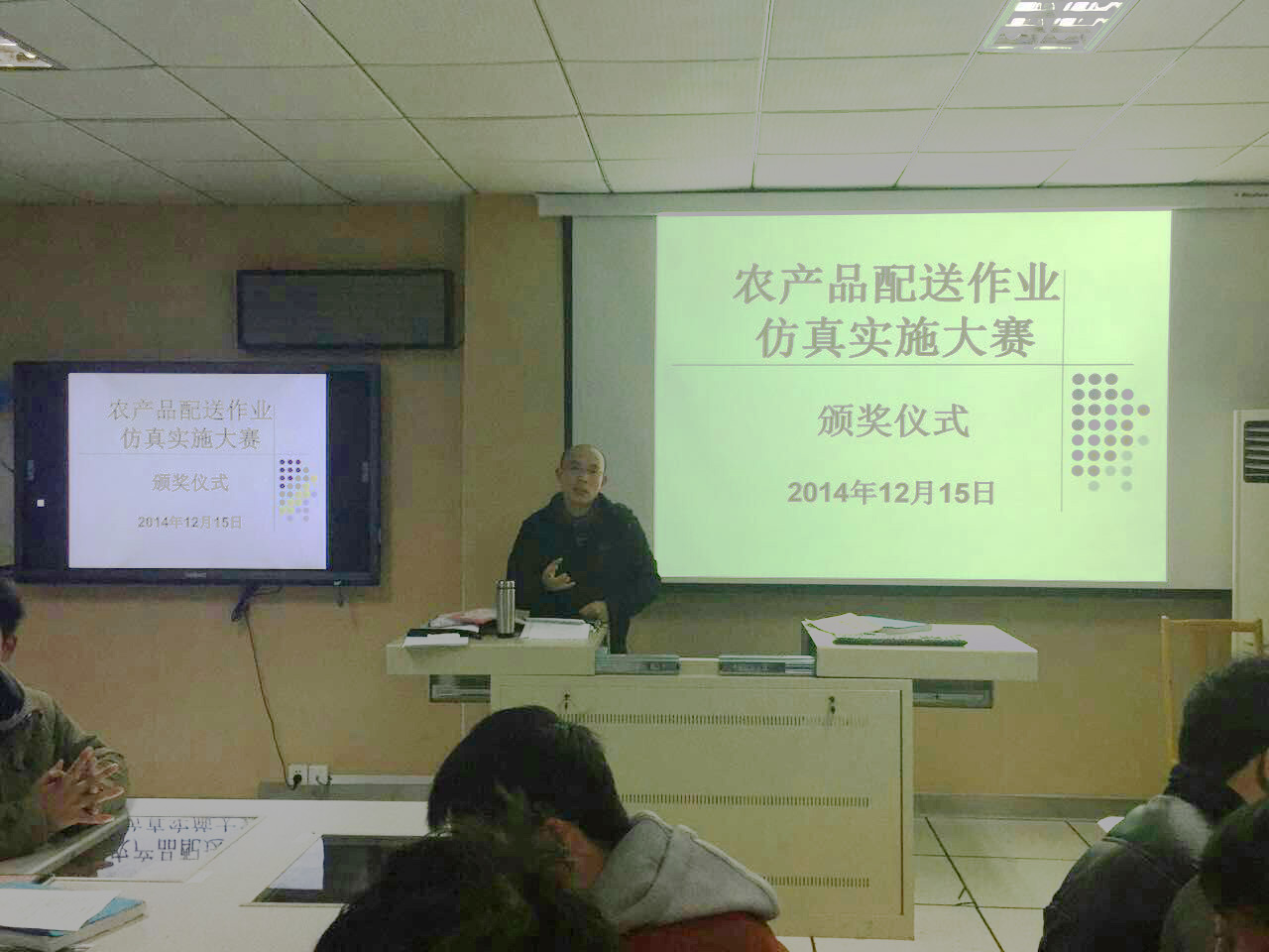 12月15日,24位参赛队员在农经楼108参加《农产品配送作业仿真实施大赛》颁奖仪式,大赛指导教师路以兴为获奖团队及团员颁奖。