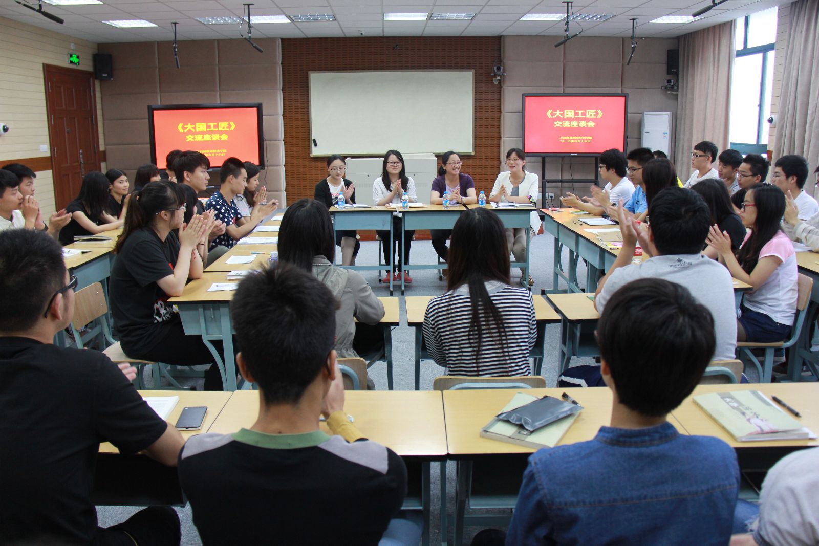 师生们纷纷发表自己的感想。大家普遍反映,看片后很有民族自豪感,开拓了视野,看到了中国的“工匠精神”,增强了作为一名中国人的大国信心。陈宇佳、钱瞿歆、诸葛莉儿、陶纪亮四位同学分别从国家、社会、学校、个人等角度发表了观点。方大伟与李鑫又分别谈了对勤学苦练、奋斗青春、职业标准的认识。