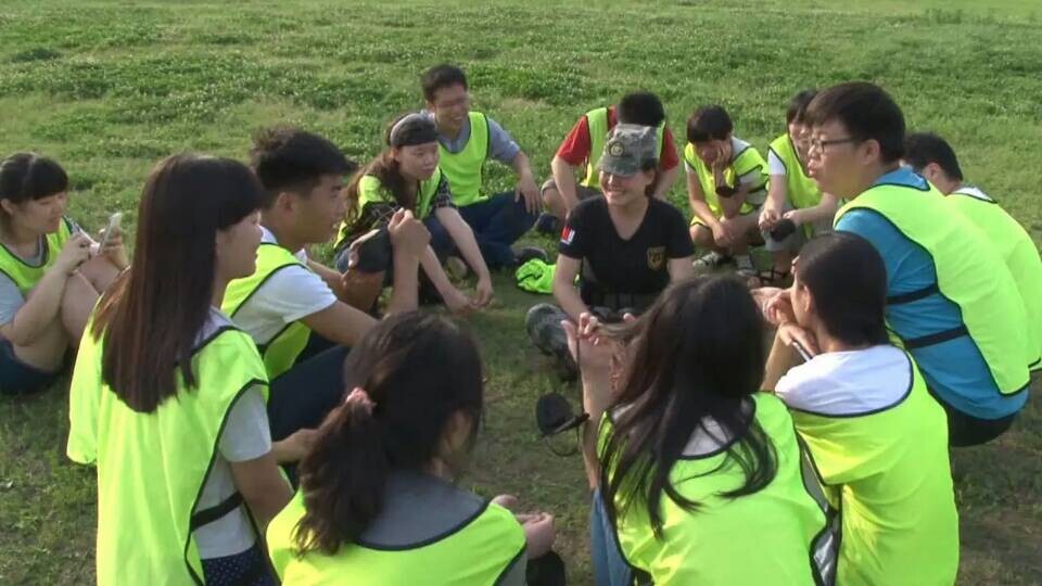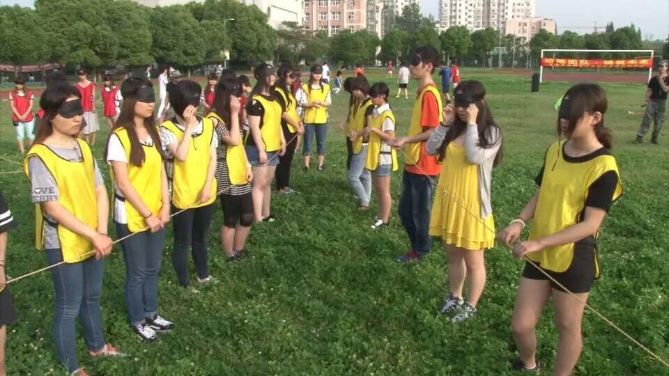 此次的素质拓展主要有两部分组成。首先,拓展训练热身,通过选队长、设计队徽、队呼、队歌和互动小游戏,增进团队成员之间的了解,激发成员的活动热情,为接下来的游戏做准备。其次,“盲人方阵”,团队成员在带眼罩的状态下,将事先准备的绳子在规定的时间内,围成各种图形,并使所有队员尽可能均匀分布在图形的几条边上。活动中,同学们沟通交流,借以集体的智慧和相互间的配合,力求争取最后的胜利。