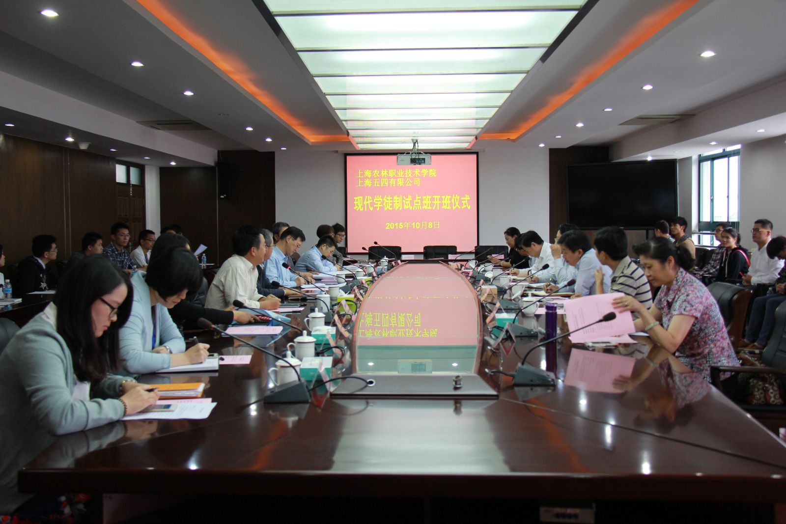 10月8下午,学院和光明食品集团上海五四有限公司校企共同组建的现代学徒制试点班开班仪式在综合教学楼1101室举行。五四公司党委书记、董事长祁瑞芝,总经理沈红然一行七人和学院党委书记吴乃山,院长魏华出席,院办、教务处、园艺园林系、农业经济管理系、校企合作办公室负责人以及‘五四园艺班’和‘五四财务班’全体学生参加会议。会议由副院长谢锦平主持。