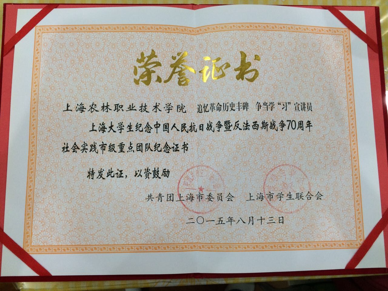 近日,从上海市“青春拥抱和平”纪念中国人民抗日战争暨世界反法西斯战争胜利70周年思想分享会上得知,农业经济管理系“追忆革命历史丰碑 争当学‘习’宣讲员”项目荣获上海大学生纪念中国人民抗日战争暨反法西斯战争胜利70周年社会实践市级重点团队纪念证书,该项目更是唯一一个获得此项荣誉的高职院校团队。