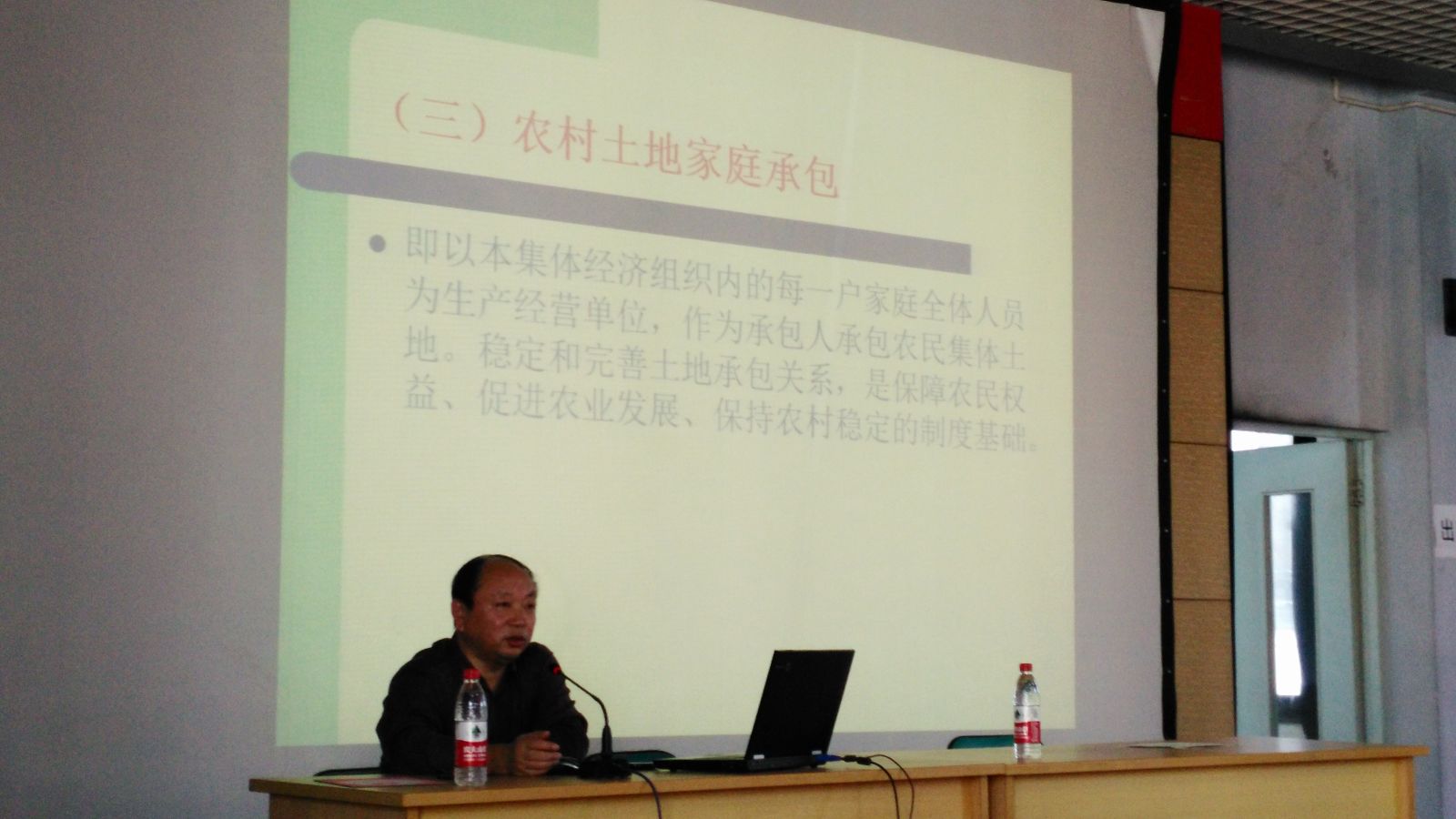 翁站长报告的题目为“农村土地承包管理基础知识”,主要包括农村土地的基本概念、《农村土地承包法》主要内容、《物权法》与农村土地承包经营权、农村承包土地经营权的流转、农村土地承包经营权登记颁证、农村土地承包经营权纠纷调解仲裁六大部分。