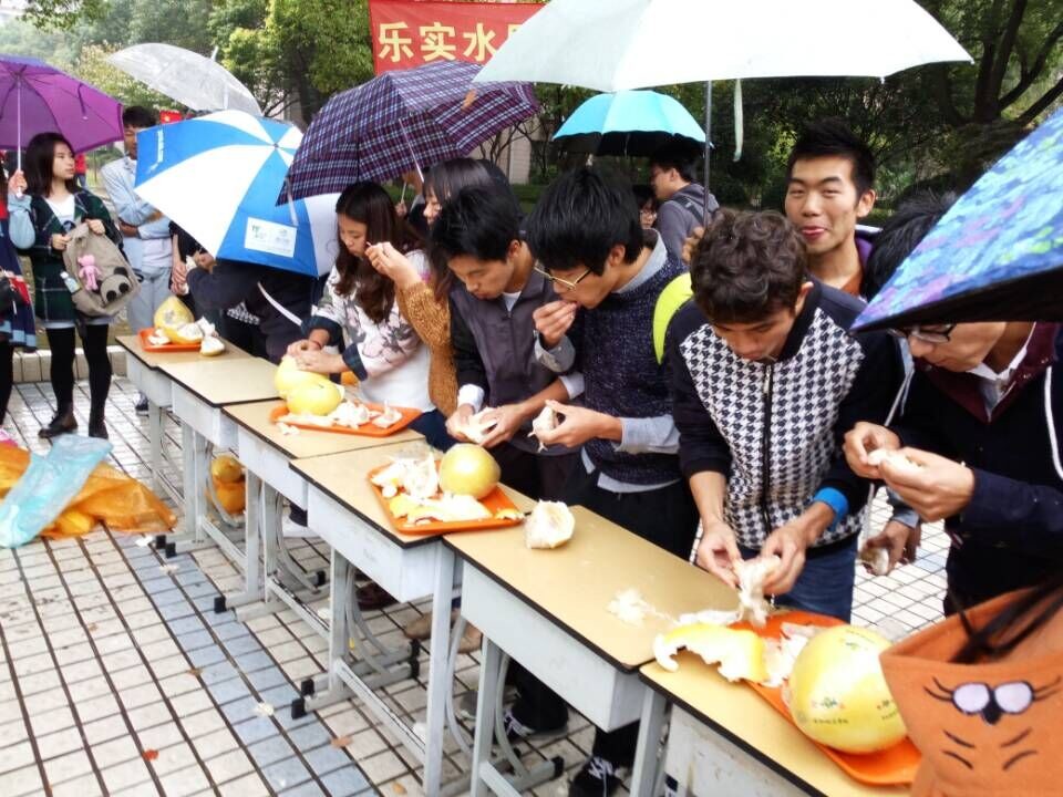 近日,由乐实农产品营销社组织策划的“吃剥柚子大赛”在一教前广场进行。虽然天气不给力,仍有相当数量的师生冒雨参加本次比赛。