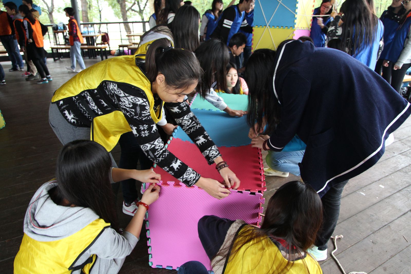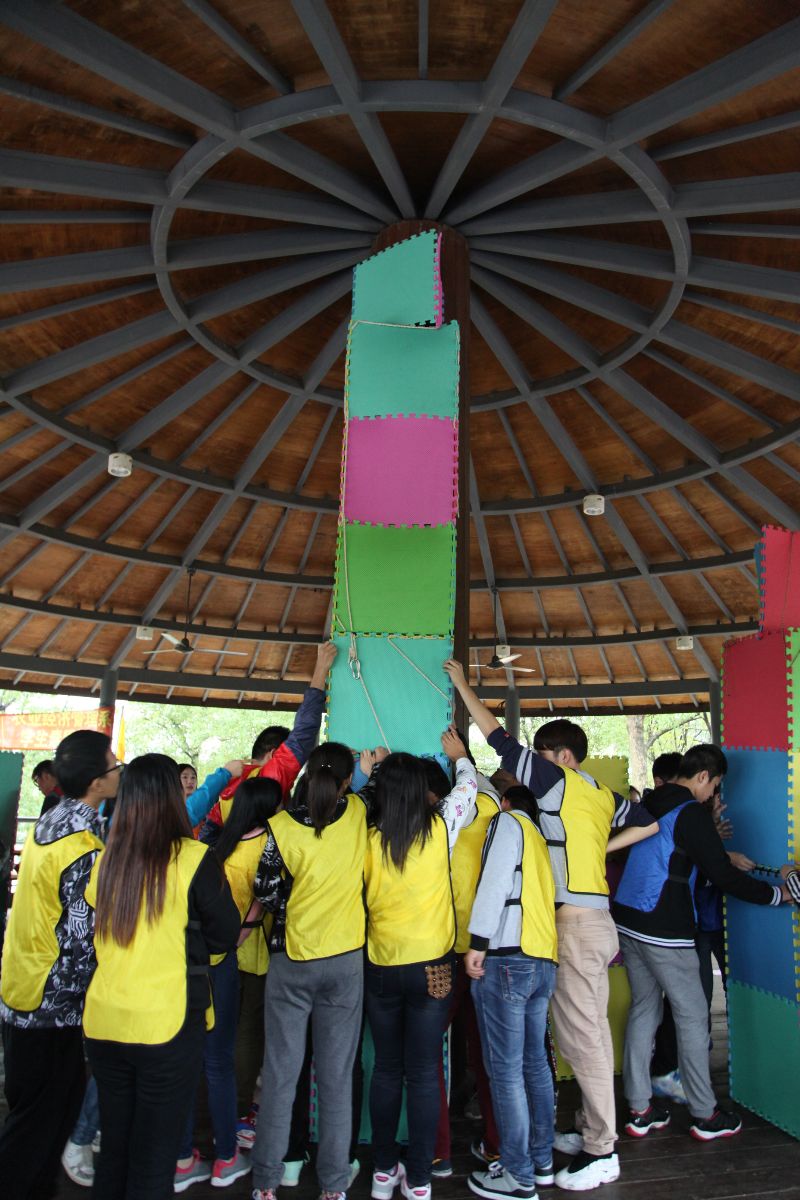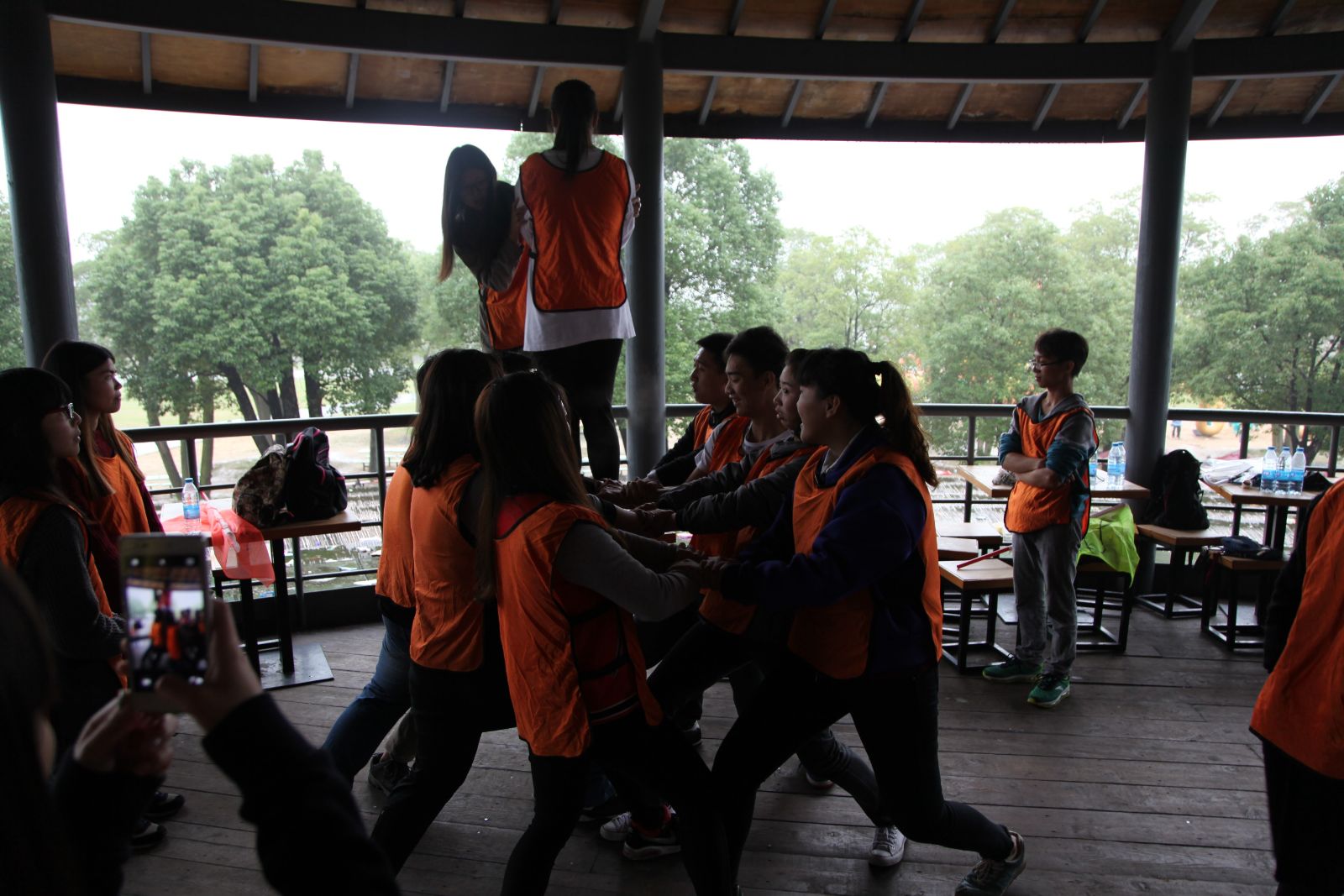 活动开始,首先,在教练的带领下,同学们通过破冰游戏,按照要求被分成了黄、橙、红、蓝四组,随后为自己所在队伍设计了队名、队棋和队歌,于是“星星”队、“一飞冲天”队、“召唤师”队、“橙里人”队相继产生,过程中不仅增进团队成员之间的了解,也激发了成员的活动热情,为接下来的游戏做准备。“信任背摔” 、“巅峰之塔”等系列活动的进行,在每个活动过程中,各组队员默契配合,踊跃表现,竞技中不失和谐,赛场上不失友谊,在加油声,喝彩声中让活动气氛一次次达到高潮,让同学们充分融入到整个团体之中。
