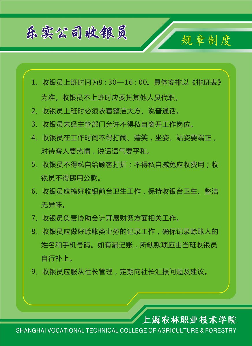 据此,近期编制了《乐实办公室日常管理制度》、《乐实营业部使用管理制度》、《乐实公司前台收银员规章制度》、《乐实营业员交接班流程图》、《乐实公司学生实战平台建设计划》、《乐实公司专业课程教学平台建设计划》,《乐实公司营业部工作人员出勤记录表》、《乐实公司办公室工作人员出勤记录表》、《乐实公司收银员交接班记录表》等等。目前,这些制度都处于试用阶段,规章管理制度的出台约束了“员工们”的行为,为各项管理工作奠定基础。