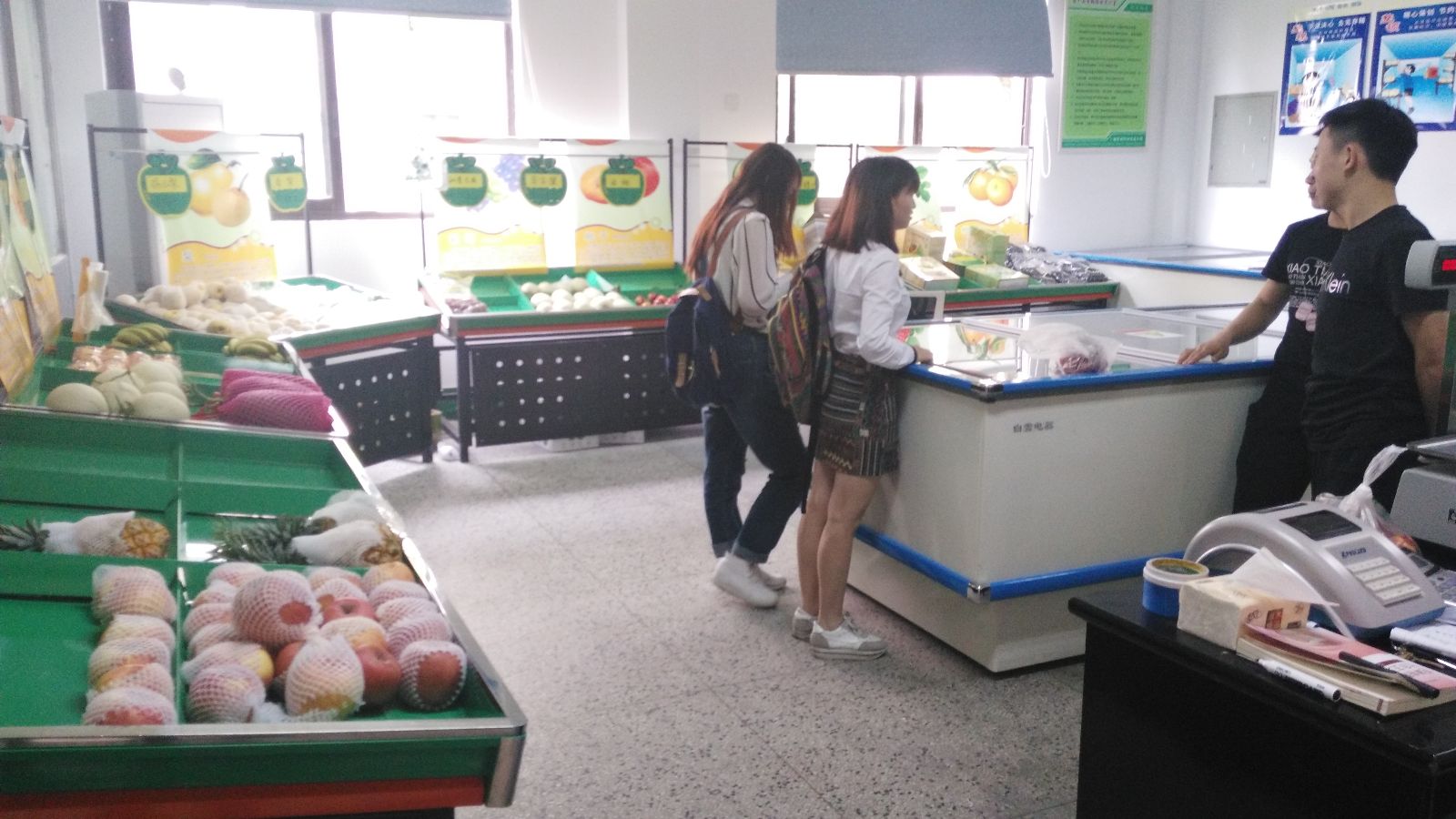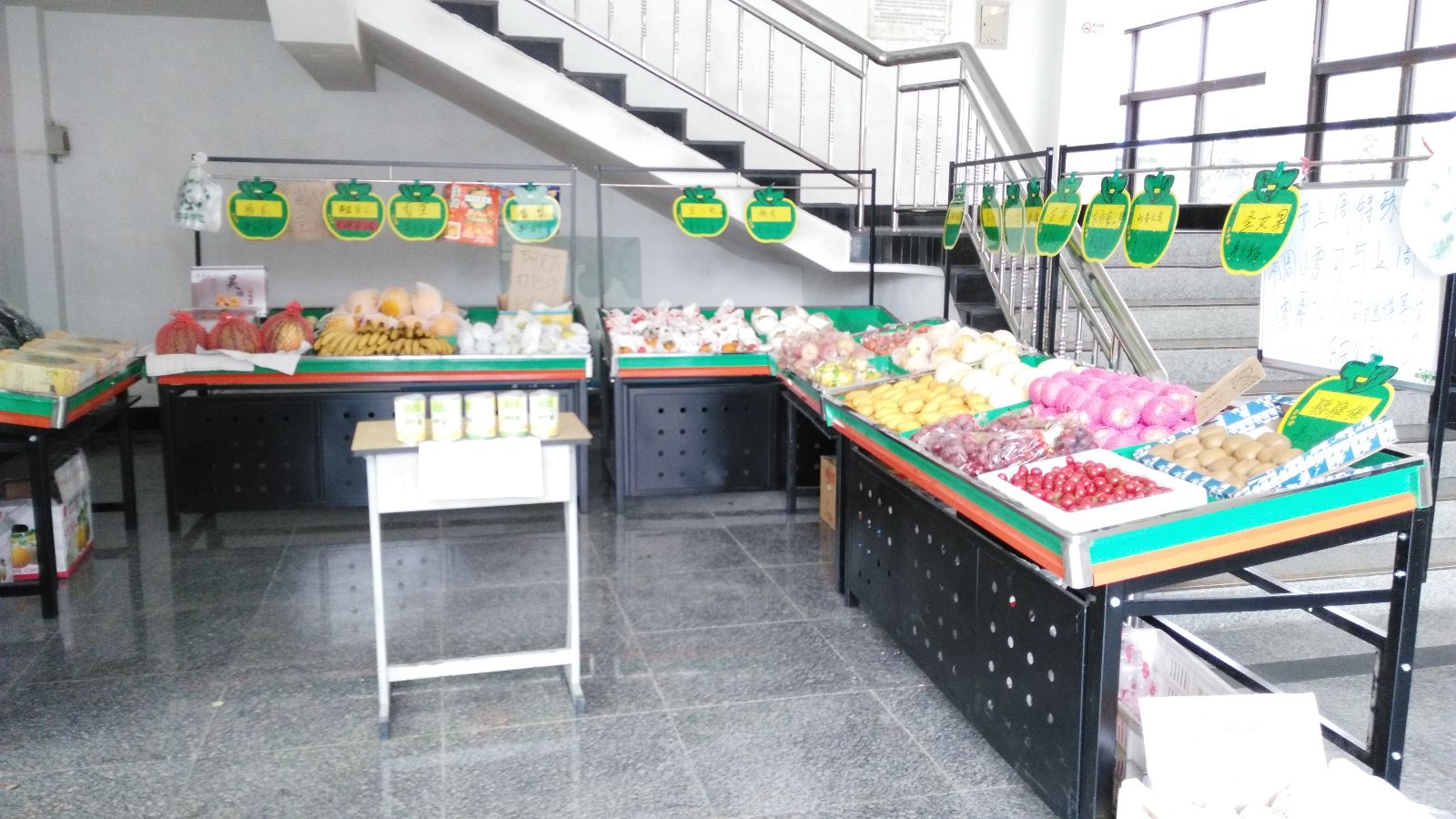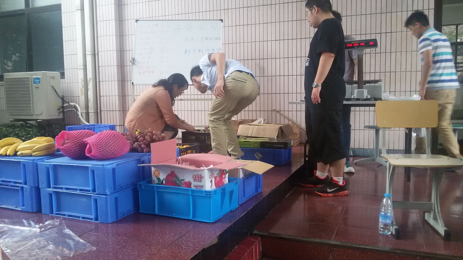 水果摊由室外转向室内,公司形象由“路边摊”转型为”水果店“,乐实”公司“终于有了公司的样子,值班学生们的积极性达到历史新高。