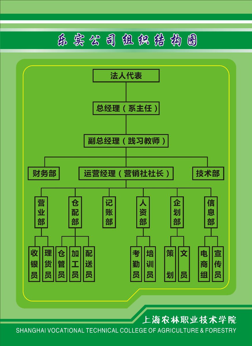 针对公司工作人员来源渠道多(实习学生、勤工俭学学生、乐实营销社学生)、归属管理关系不清、信息沟通渠道不通、工作矛盾频发等现象,对公司工作人员进行了统筹安排,统一纳入乐实营销社管理,营销社社长作为实习锻炼学生的总管家,一切行动服从社长管理,社长在践习教师的指导下完成公司运营工作。据此编制了乐实公司组织结构图,试运作半个月来,学生权责关系逐渐清晰,学生工作积极性得到激发,学生管理工作量有所减少。