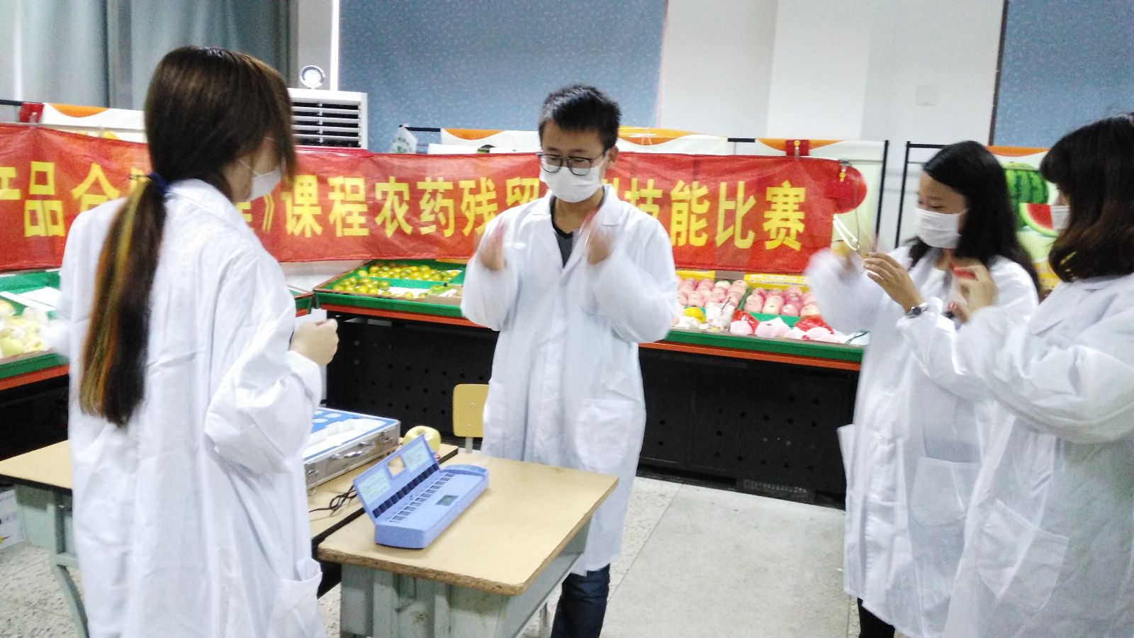 本次“农残检测”实训项目安排分为“任务导入”、“教师演示”、“现场练兵”、“技能比武”、“学生体会”、“教师总结”六个环节,项目负责人老师首先介绍了农残检测的必要性,然后现场演示“农残检测”的过程,指出设备操作的注意事项;由于乐实公司场地限制,本次实训操作环节安排乐实公司营业厅和实训室两个场所同时进行,通过练习和比武,学生们掌握了农残检测技能,认识到了团队合作的重要性,从测试结果上看,水果的农残还是难免的,也提示我们吃水果前一定要清洗水果表面,最好切皮后食用。从“学生体会”环节的交流来看,学生们对本次实训较为感兴趣,在设备操作的过程中意识到了团队的重要性,基本掌握了农残检测这项技能。
