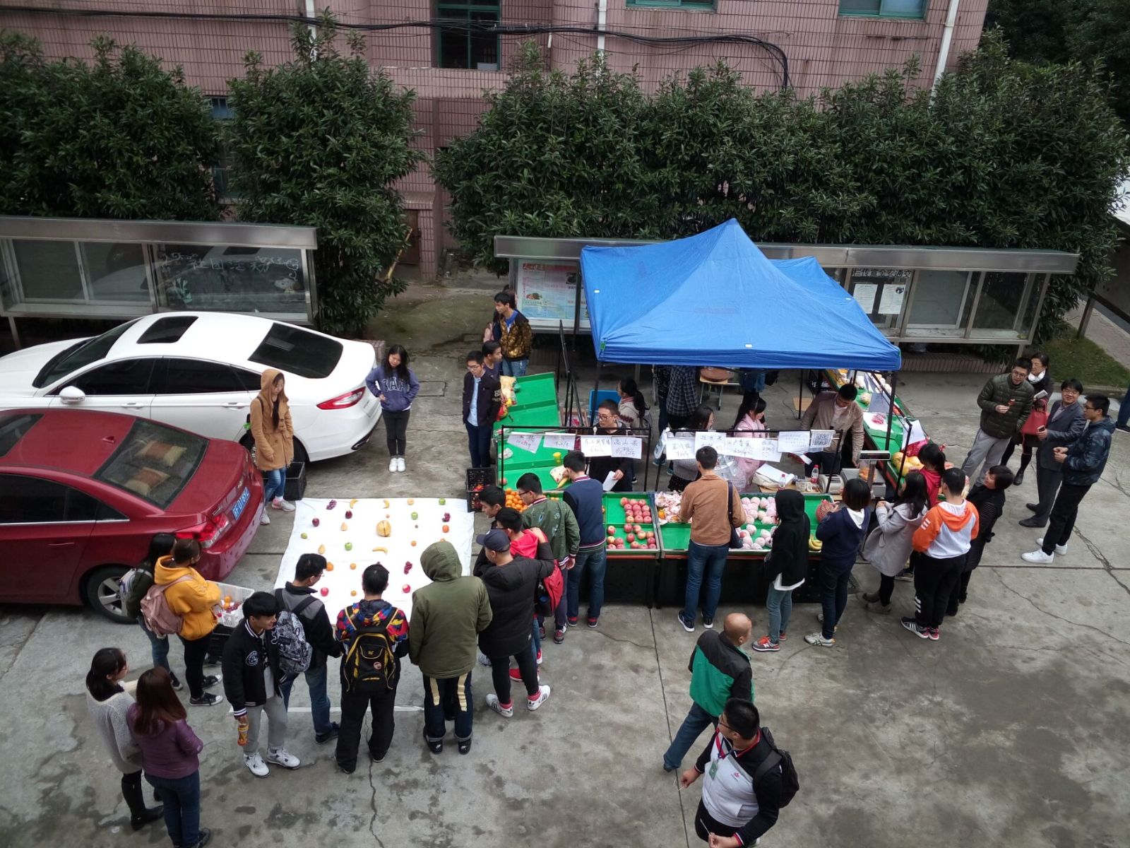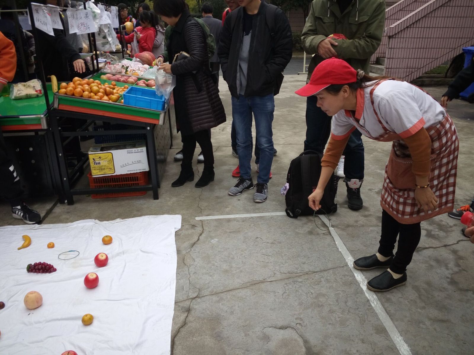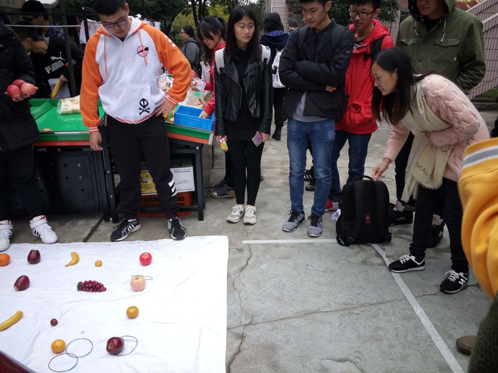 11月10日中午11点多,乐实营销社开展了“双11,造起来”送温暖计划的首秀,在食堂南侧办起了“套圈圈,赢水果”的活动,参加活动的主要方式是,购买的水果总价为11元、22元或者33元,就可以获得套圈,免费进行套水果游戏,套中的水果就可以被参与者拿走。