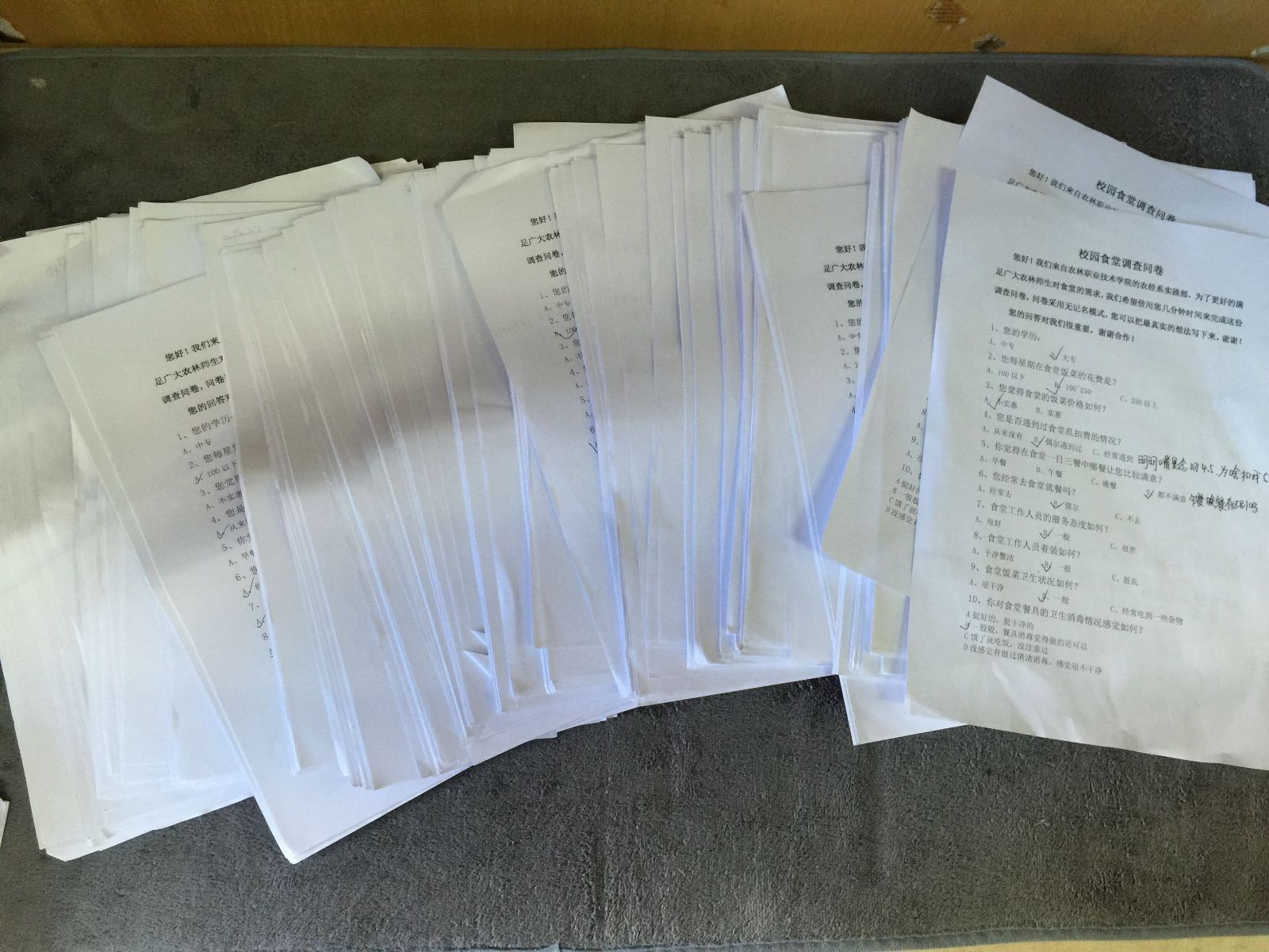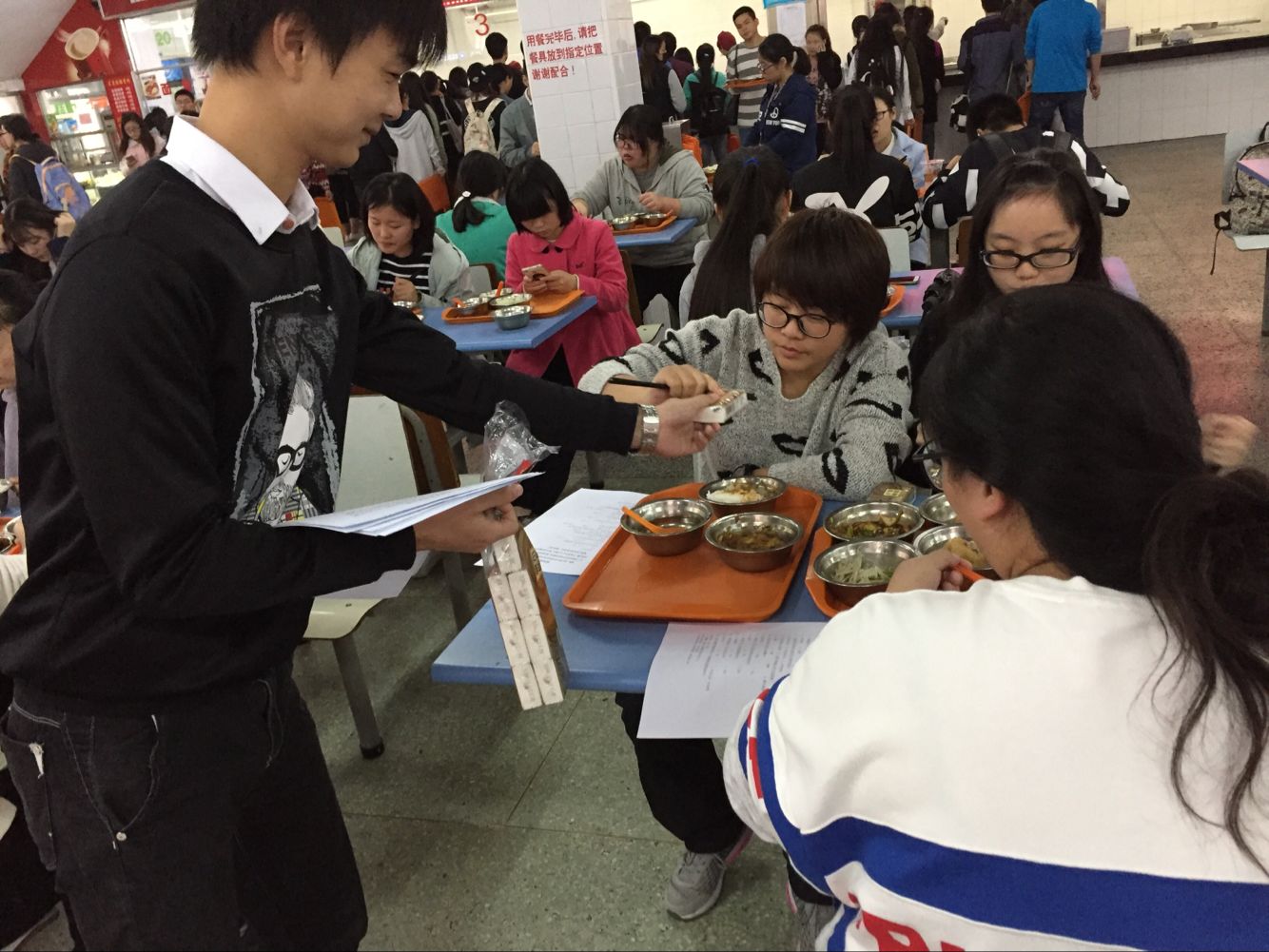 随着下课铃的响起,同学们都陆续走进食堂,为了解广大在校师生对食堂的卫生、环境、饭菜质量、价格和服务态度等方面的看法,实践部成员开始了他们的调查活动。 “你好,打扰一下,可否方便对有关食堂的看法填张调查问卷?”同学们都十分配合,并认真的填写了问卷。调查小组的成员们除了礼貌致谢外,还依次向每位接受调查者赠送一包纸巾作为答谢。