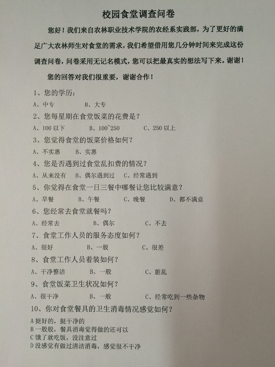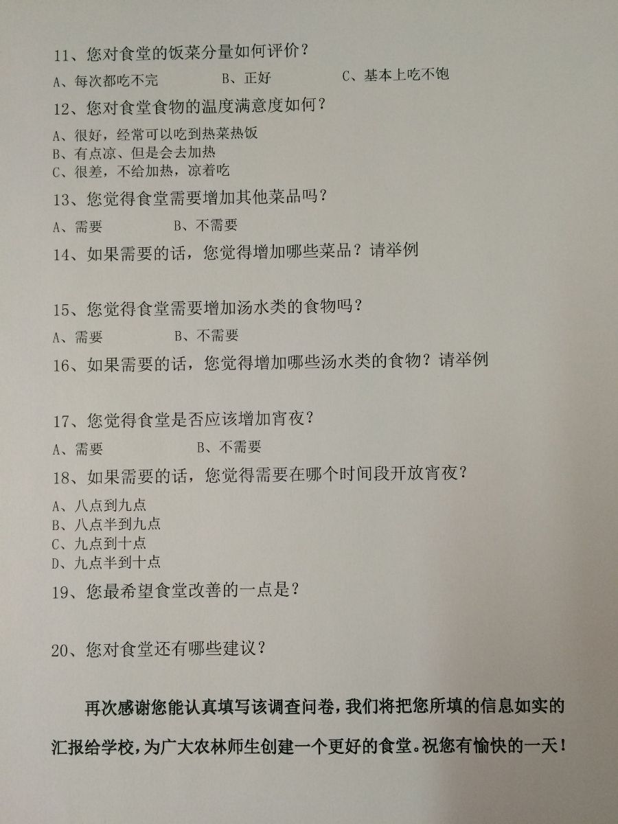 民以食为天,饮食是我们生活中不可缺少的重要部分。通过此次问卷调查,充分收集了广大同学们的想法和建议,并尽快统计好后上报给学院后勤部门,为学校创造一个和谐的就餐环境贡献自己的力量。