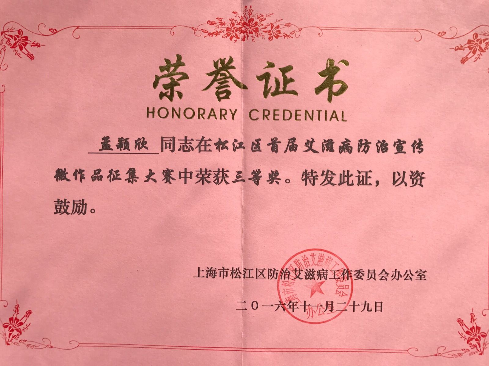 2016年11月29日下午,孟颖欣同学作为我校获奖代表前往松江区政府参加了颁奖仪式。参加颁奖仪式的有松江区各级领导、区各部门、乡镇街道办事处的相关负责人及获奖代表。松江区防治艾滋病工作委员会办公室主任、松江区卫计委副主任刘俊简要回顾了今年松江区禁毒防艾工作的开展情况,对各单位开展的禁毒防艾宣传教育工作给予了充分肯定。同时也对相关部门提出新要求,并邀请了艾滋病预防专家康来仪教授为大家现场讲授艾滋病科学防治知识。