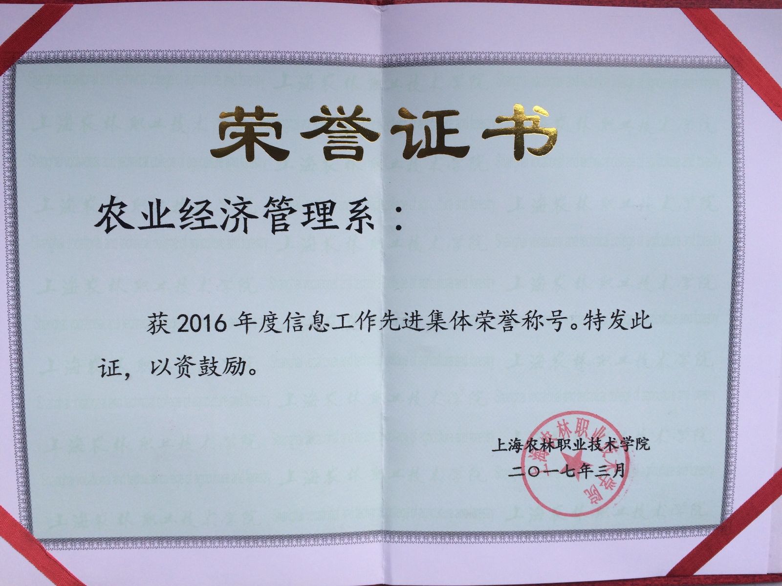 热烈祝贺农业经济管理系荣获“2016年度信息工作先进集体”称号。一年来,农业经济管理系始终把做好信息宣传摆在日常工作的重要位置,紧扣要点,强化管理,使农经系信息工作取得了较好的成绩。