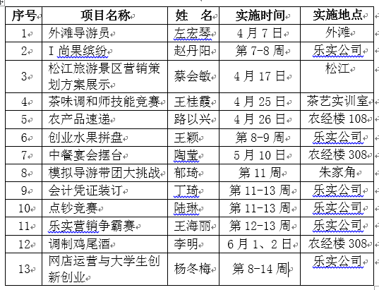 为了推进休闲农业品牌专业和农业经济管理骨干专业建设,进一步深化教学改革,发挥乐实公司教研教改平台优势,农经系联合乐实农产品销售公司启动了“乐实杯”品牌实训项目创建活动。经过系部和乐实公司的筹划动员,共有13位教师采用微信报名的方式参与了本次活动,提供了丰富多彩的实训主题。其中,7位农业经济管理专业教师设计了农产品速递、农产品流通加工、网店运营、农产品营销、会计凭证装订、点钞等方面的项目,6位休闲农业专业教师提供了景区营销方案策划、导游、中餐宴会摆台、调味、调酒等专业实训。各项实训项目主题涵盖了我系各专业的主要教学内容,突出训练学生的知识运用能力和动手操作能力,为调动学生学习主动性、提高教学质量、增强理实结合程度奠定了基础。