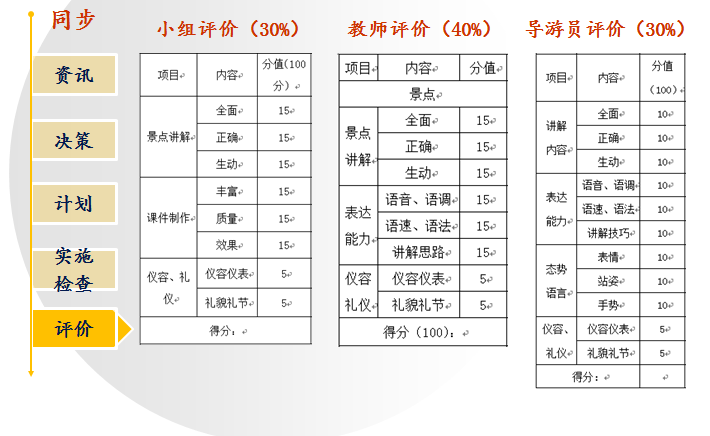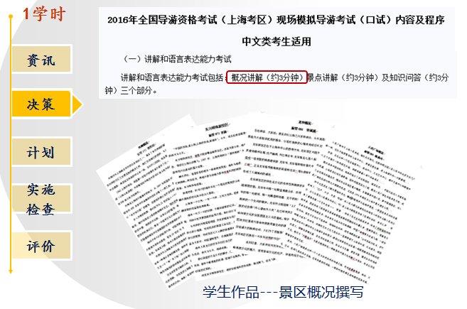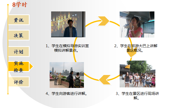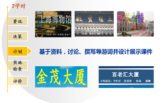 该项目通过资讯-决策-计划-实施-检查-评价六个步骤展开。全班同学分为9个小组,各组搜集了外滩游览区资料,撰写了导游解说词,根据9个景点解说任务制作了ppt,并明确了评价标准。每个环节都以小组形式完成,在增强业务素质的同时,也增强了同学们的团队合作意识。