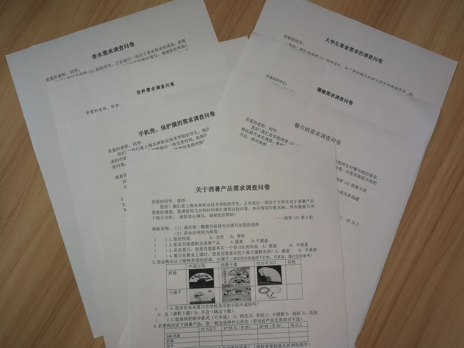 商管151班按照4人一组,分成七个销售团队,针对我院在校学生的具体日常需求设计问卷展开实地调研,线上利用问卷星借助微信朋友圈进行调查,线下利用晚自习时间在教室进行问卷调研,通过搜集上来的问卷展开市场分析,并据此确定各组要经营的具体产品,七个销售团队最终选择了经营包括零食、饮料、香水小样、手机壳、墨镜、纸巾和折扇、USB风扇、避蚊手环等消暑产品在内的多种产品。