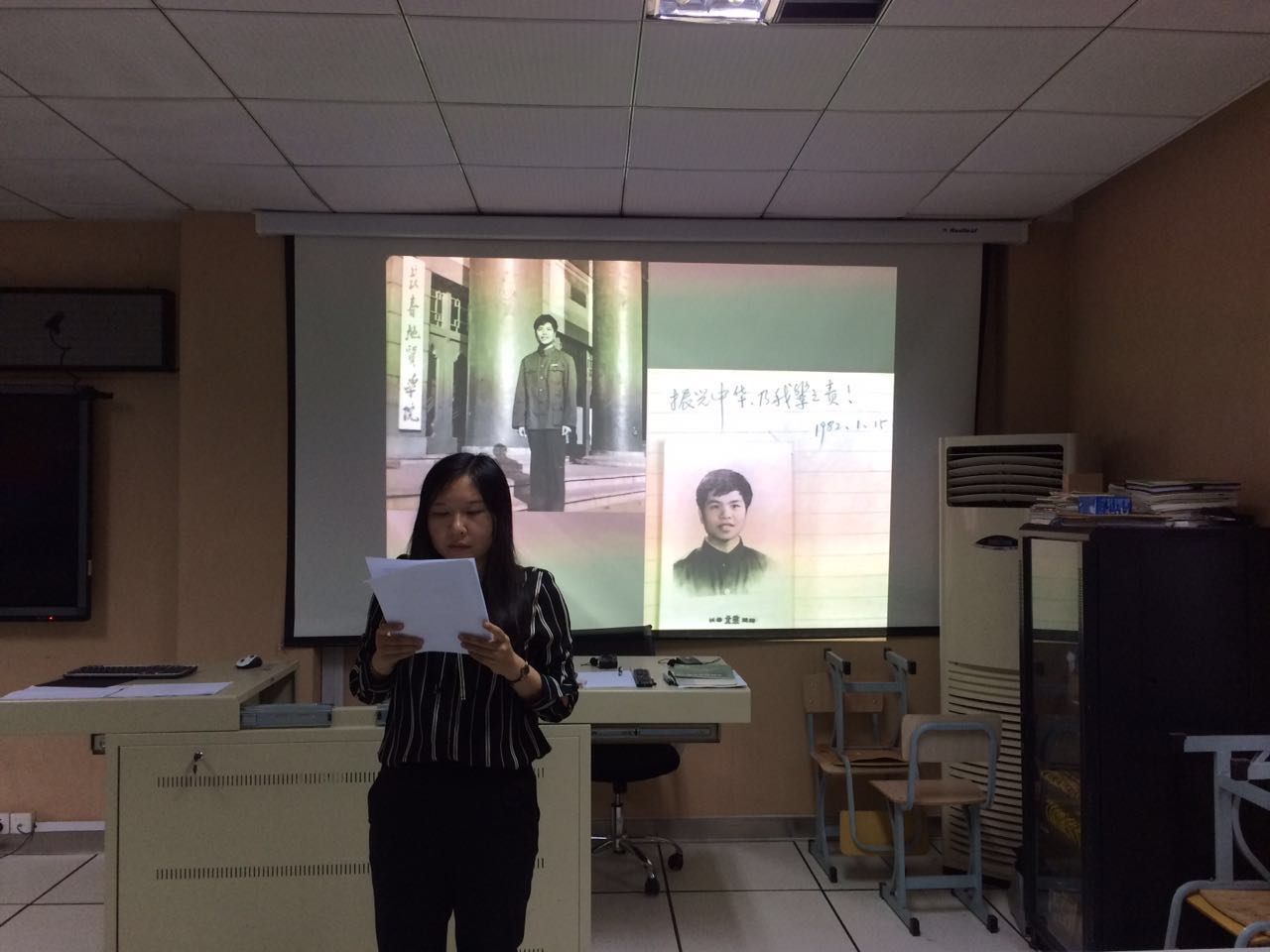 沈书记先播放了央视网上,吉林省《新闻早报》的视频片段《黄大年:生命,为祖国澎湃》,视频讲述了黄大年同志秉持科技报国理想,把为祖国富强、民族振兴、人民幸福贡献力量作为毕生追求,为我国教育科研事业作出了突出贡献,他的先进事迹感人肺腑。党员同志们深受感动。接着支部组织委员张婧敏将黄大年的生平事迹娓娓道来,一个活生生的人物形象脱颖而出,他给同学毕业赠言铿锵有力:振兴中华,乃我辈之责!