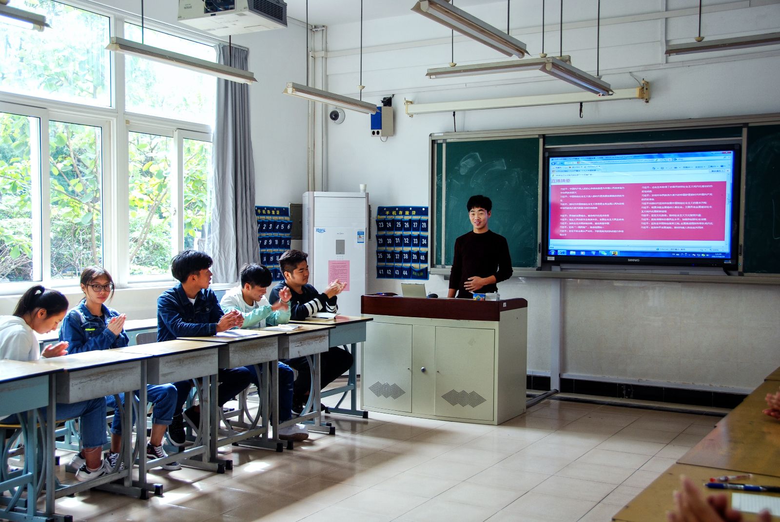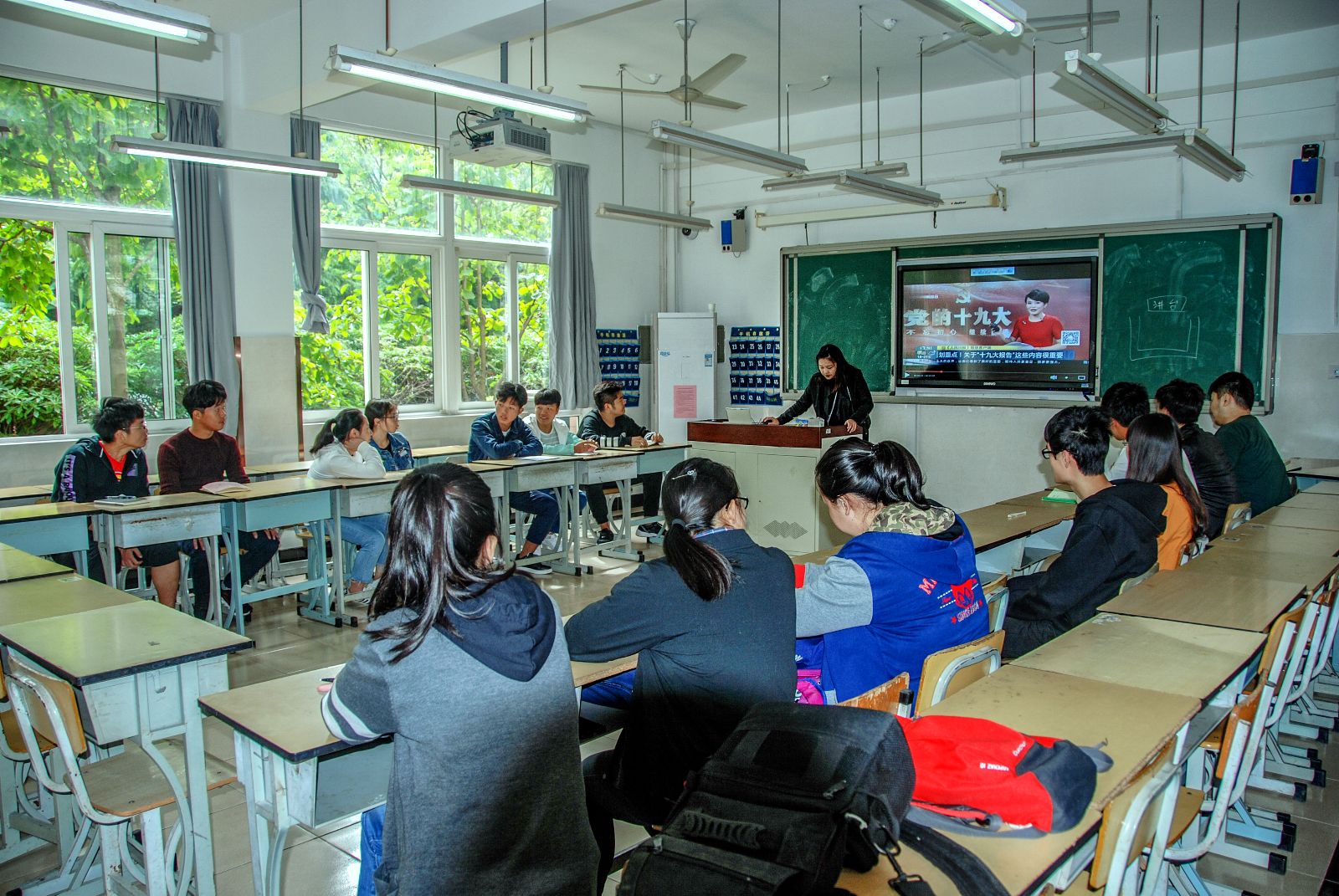 活动由团总支周培璐主持,首先她带领大家观看了精简介绍十九大会议内容的视频,然后参加活动的同学轮流上台发表了自己对十九大会议内容的看法和建议。