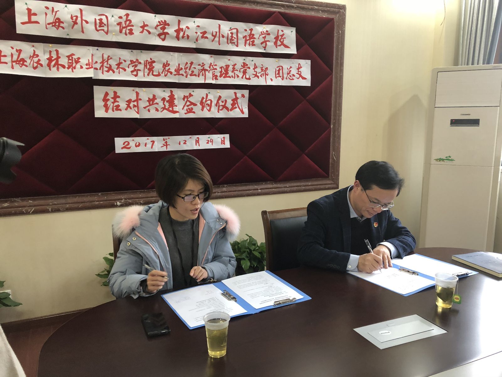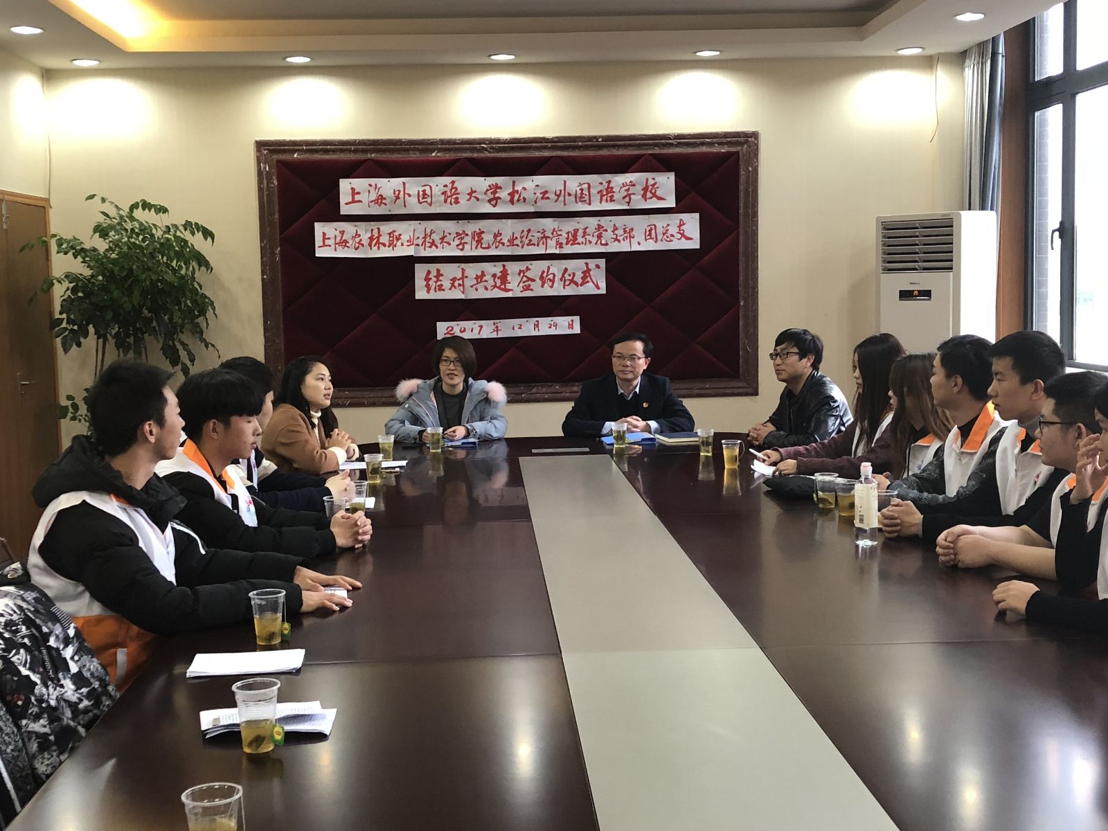 为深入贯彻习近平总书记系列重要讲话精神,构建大、中学统筹联动的团建新格局,进一步巩固学校共青团在全团的基础性、战略性、源头性地位和作用, 12月29日下午,农经系党支部和团总支与上海外国语大学松江外国语学校团委顺利完成了“结对共建”签约仪式。上海外国语大学松江外国语学校党支部书记王吉群、校团委书记政教处副主任杨利抗、农经系党支部书记许昊、党支部组织委员张婧敏以及农经系9名志愿者代表参加了此次签约活动。会议由农经系团总支周培璐主持。