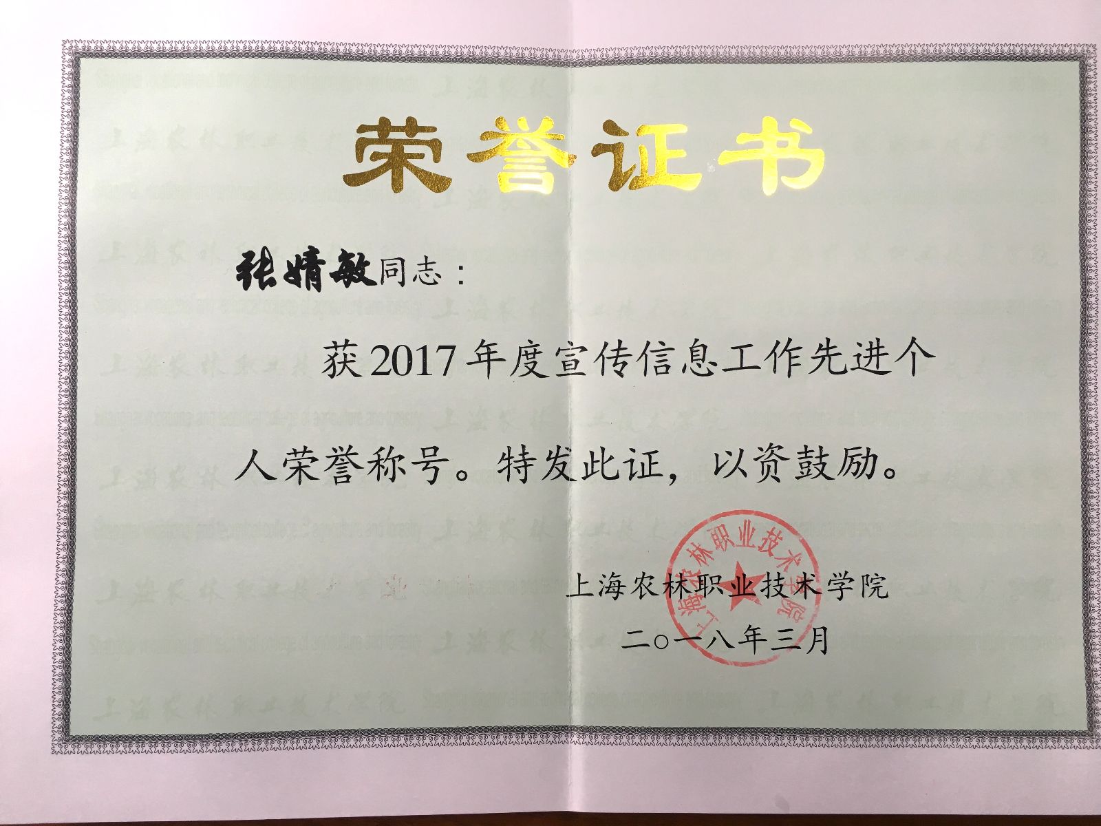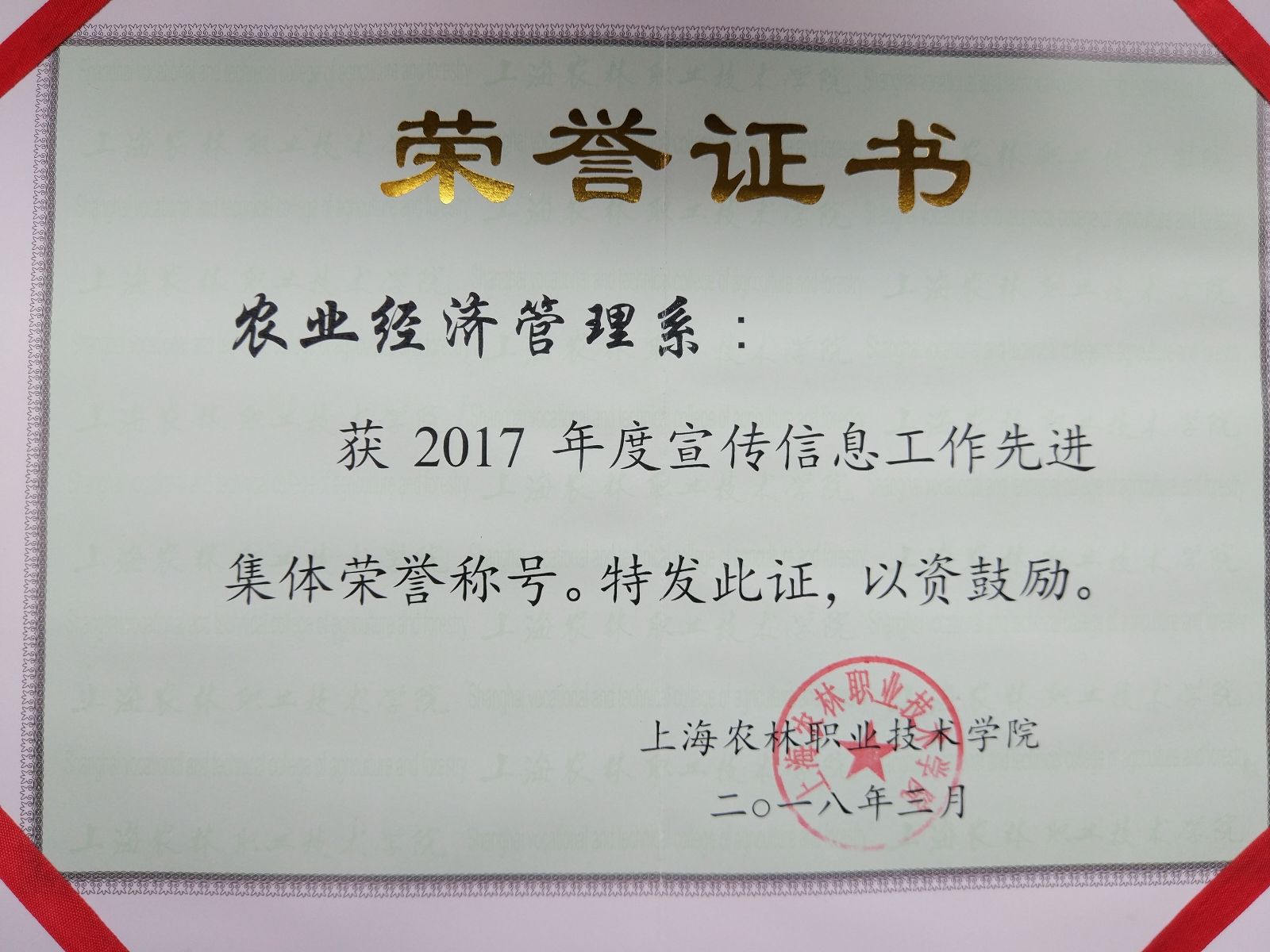 热烈祝贺农业经济管理系荣获“2017年度宣传信息工作先进集体”称号,张婧敏老师荣获“2017年度宣传信息工作先进个人”称号。