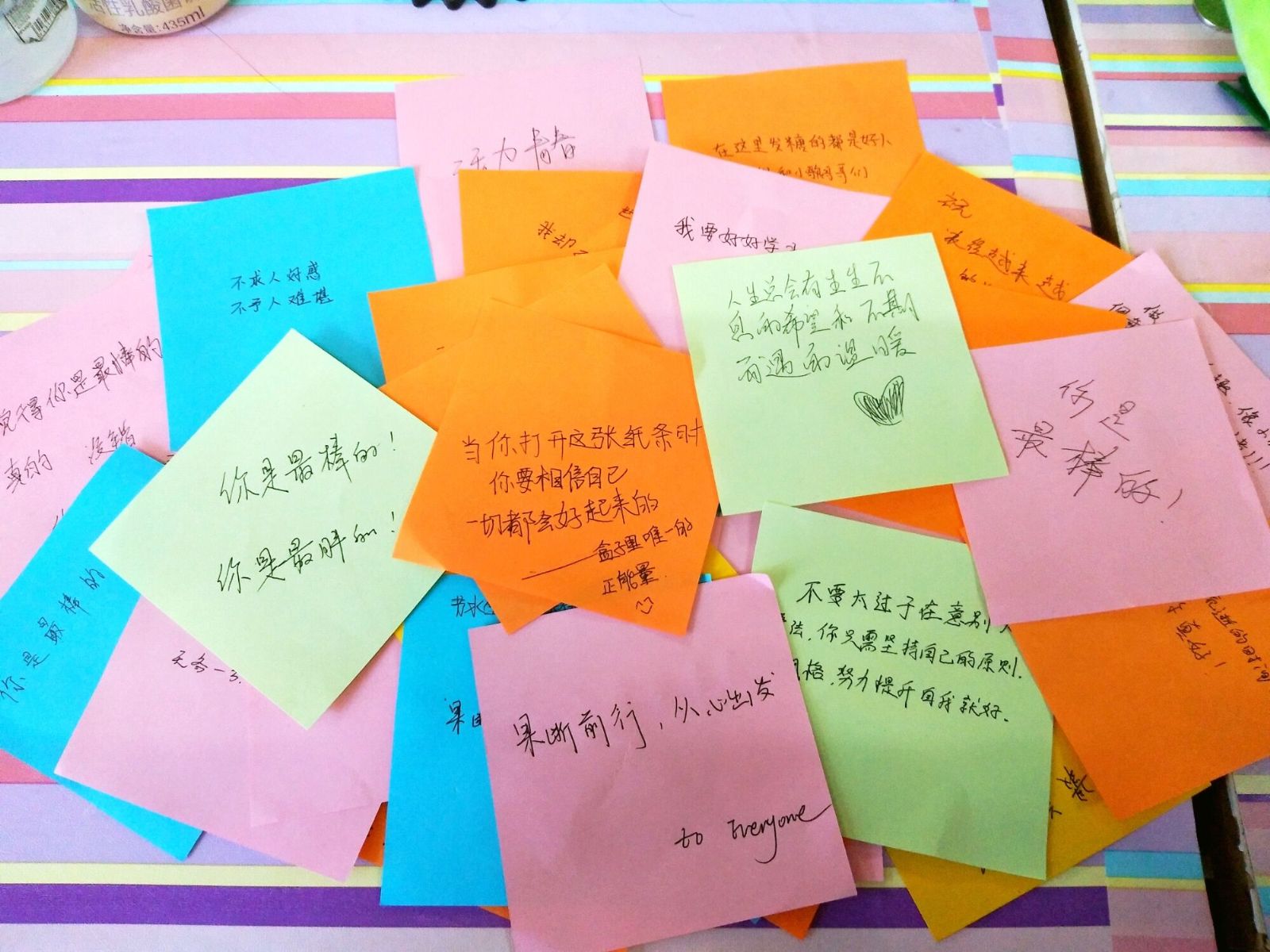 本次温馨寄语活动已经结束,每位参加的同学不光自己书写了正能量的话语,也收到了一份正能量的“鸡汤”文。相信他们会以积极进取的心态去面对之后的学习和生活,同时营造和谐愉快的校园气氛。