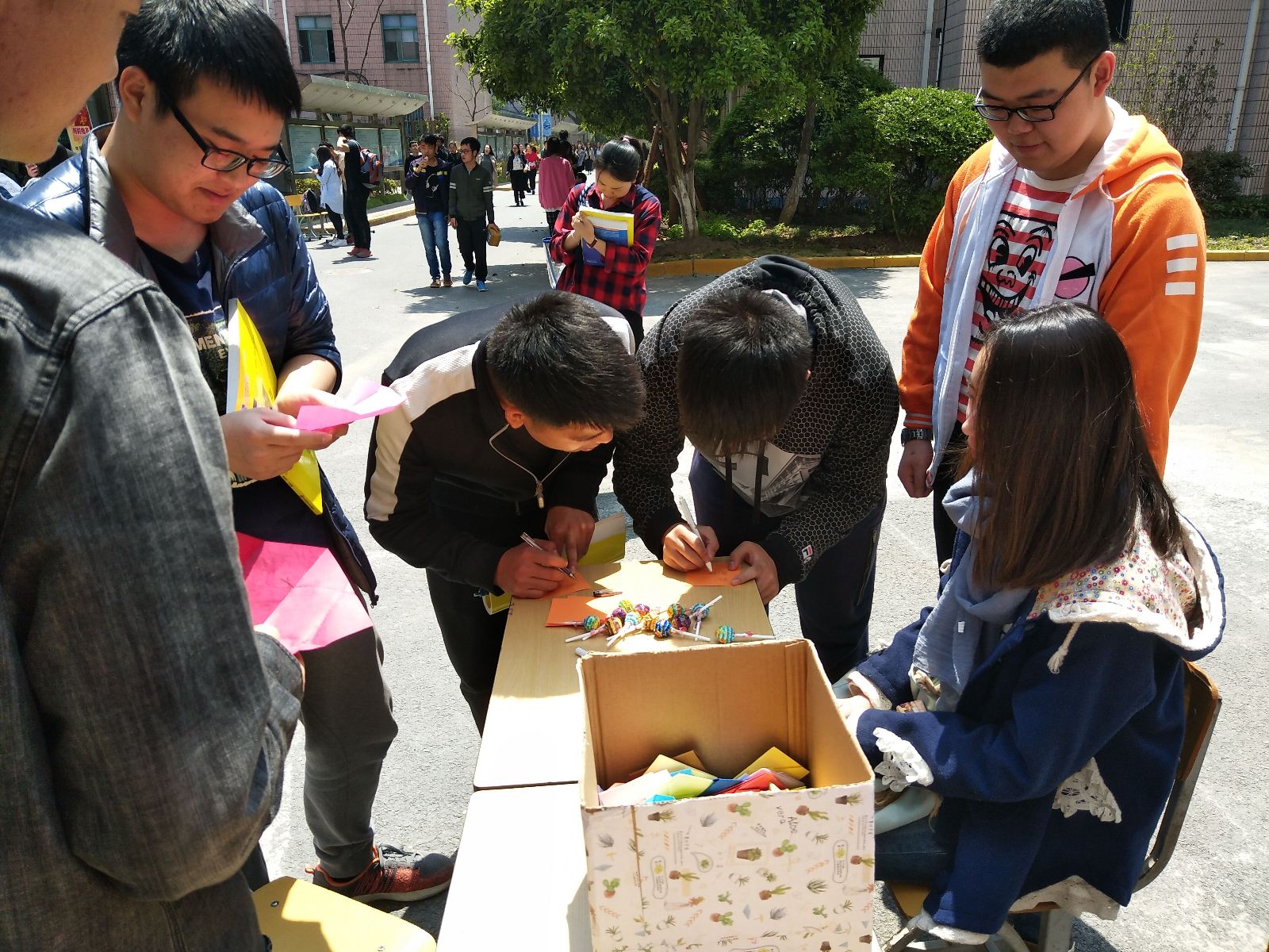活动开始后,工作人员邀请同学们用提供的纸张折千纸鹤、爱心、小星星等,并且在自己作品上面写上温馨寄语、正能量的话语将其放进我们准备的盒子里,同时将生活中遇到的不满、困惑等负能量的东西都可以匿名写在纸上,然后投进宣泄箱中,最后可以从装满正能量的盒子里随机抽取一张折好的纸。同时也向路人发放正能量盒子里的纸张。活动中同学们自由发挥,书写温馨寄语,正能量盒子就像潘多拉魔盒一样每个人抽到的寄语都不一样。参加活动的同学还有小礼品可以赠送,同学们都充满好奇,跃跃欲试。