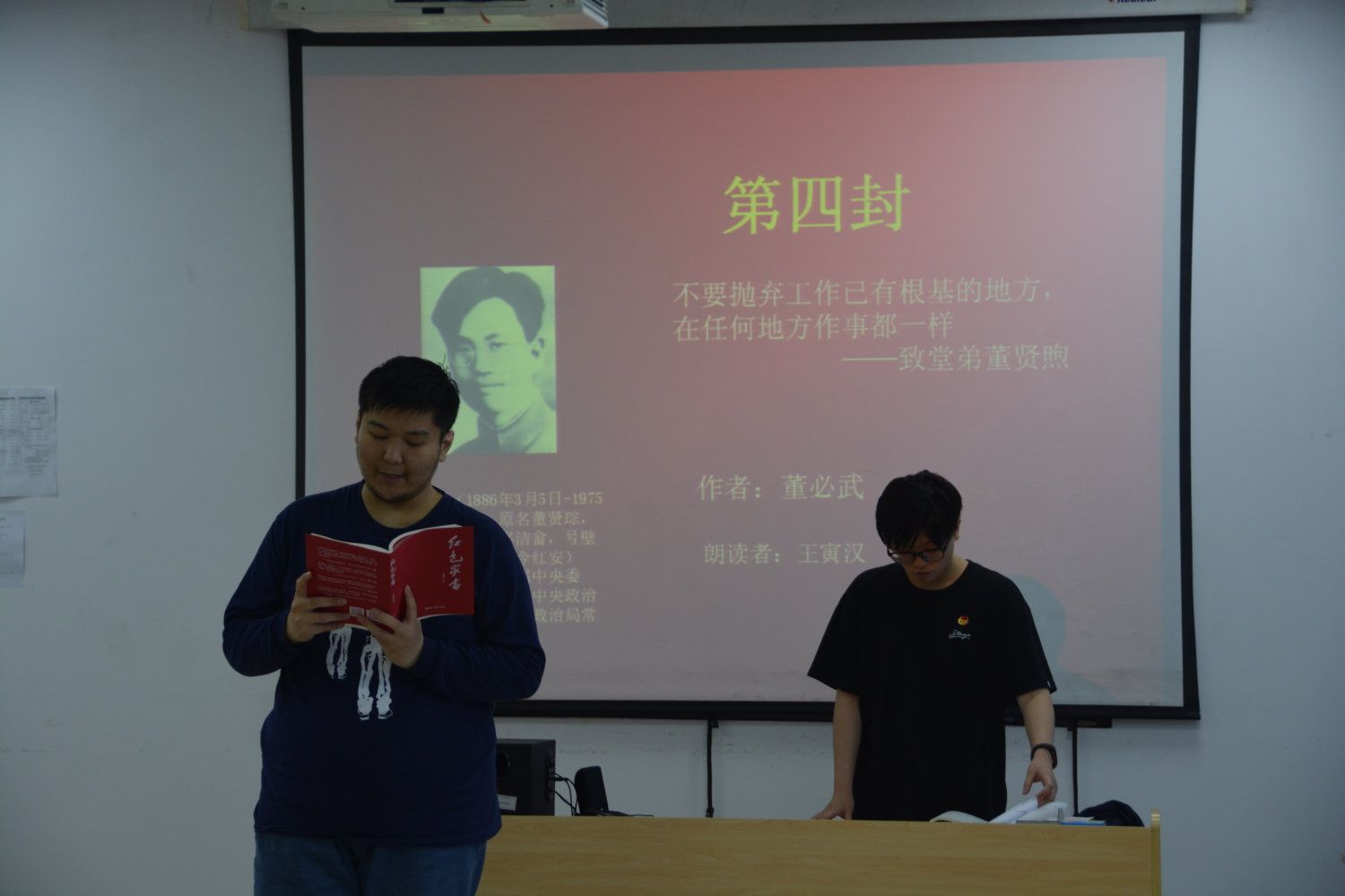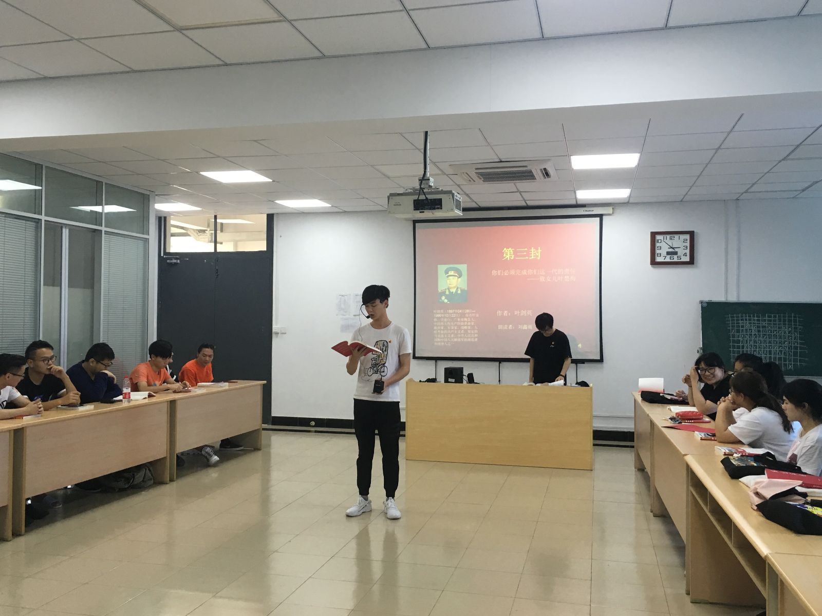 《红色家书》共有四个篇章——明志篇、正己篇、亲情篇和教子篇,活动开始,四位同学从这四个篇章中选取了各自印象最深刻的段落进行了诵读。刘鑫雨诵读的叶剑英写给女儿叶楚梅的家书——《你们必须完成你们这一代的责任》饱含深情,伴随现场配乐,极具感召力,这封家书不仅饱含了作者对女儿的关心,更提出了对她们这一代人的要求,要求她学习好科学知识,为建设全新的中国而努力。王寅汉诵读的董必武写给堂弟董贤煦的家书——《不要抛弃工作已有根基的地方,在任何地方作事都一样》,铿锵的话语、昂扬的精神令人倍感振奋,激励青年人应勇担大任,认真完成本职工作,奋力走好新时代的长征路。