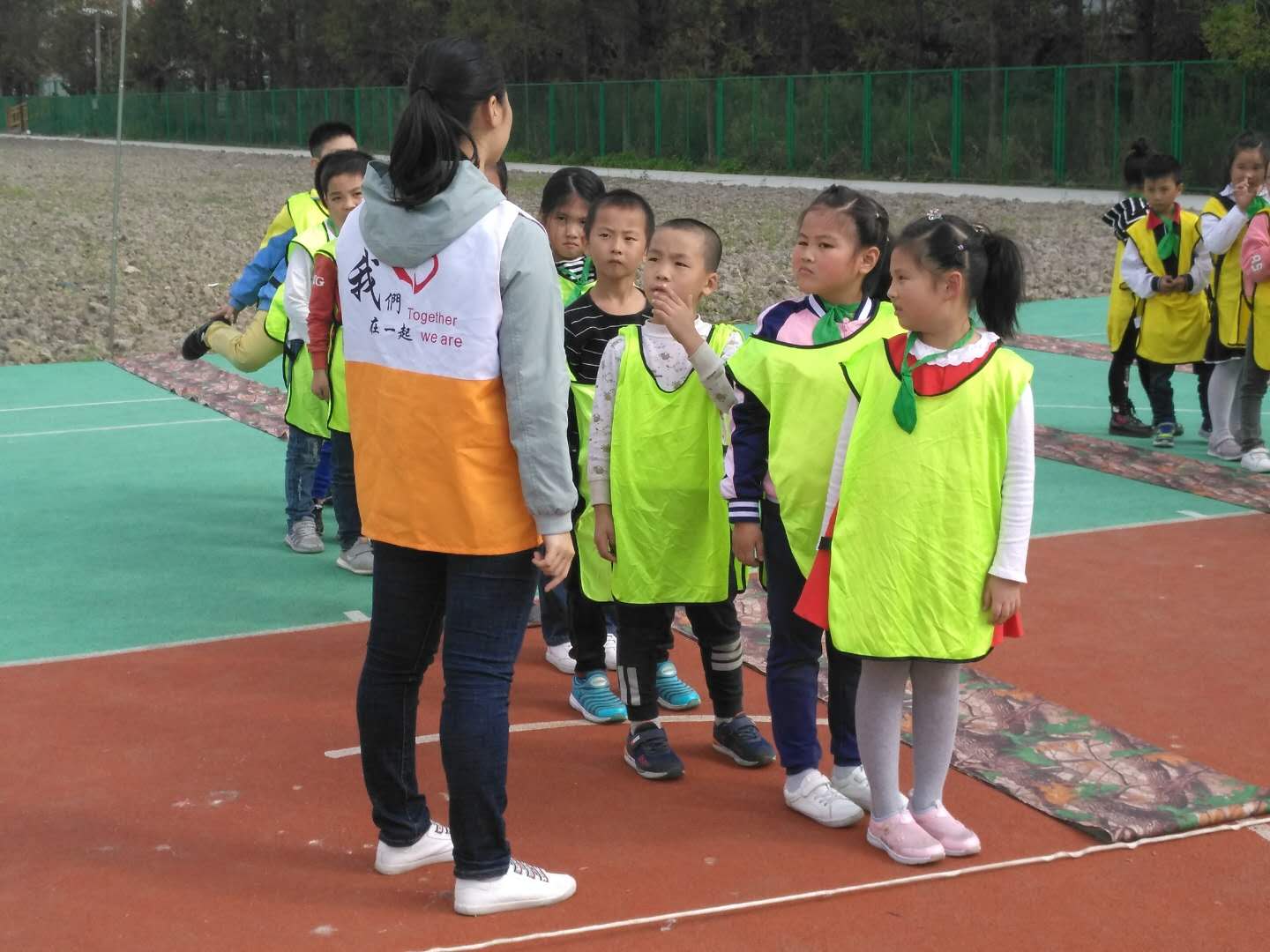 志愿者们将小学生们带领到操场后,在教官的指导下,学生们分成五支队伍开始拓展训练,围绕着“解手链”、“蚂蚁搬家”、“车轮滚滚”等系列活动进行了生动而有趣的拓展。“解手链”活动中,小组成员需要面朝外且手拉手围成一圈,大家一起在手不分开的情况下面朝里围成一圈,一开始不得要领的五支队伍都失败了,但是在志愿者的提醒下小学生们马上学到了诀窍,动作越来越快。