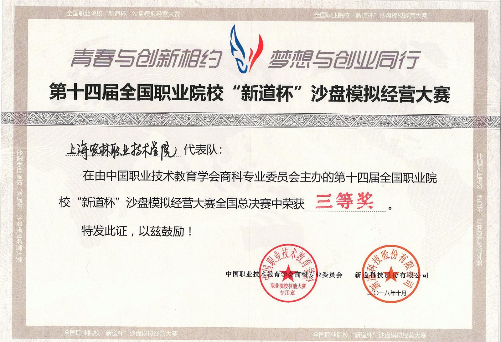 2018年10月19日-10月21日,第十四届全国职业院校沙盘模拟经营大赛总决赛在山东商业职业技术学院举行。农经系的屠星辰、王维霞、蒋屹琳、陈柯屹和王俊彦五位同学代表我校与来自全国各地近百所院校的500名学生同台竞技,经过一天紧张且激烈的角逐后,最终获得团队三等奖。