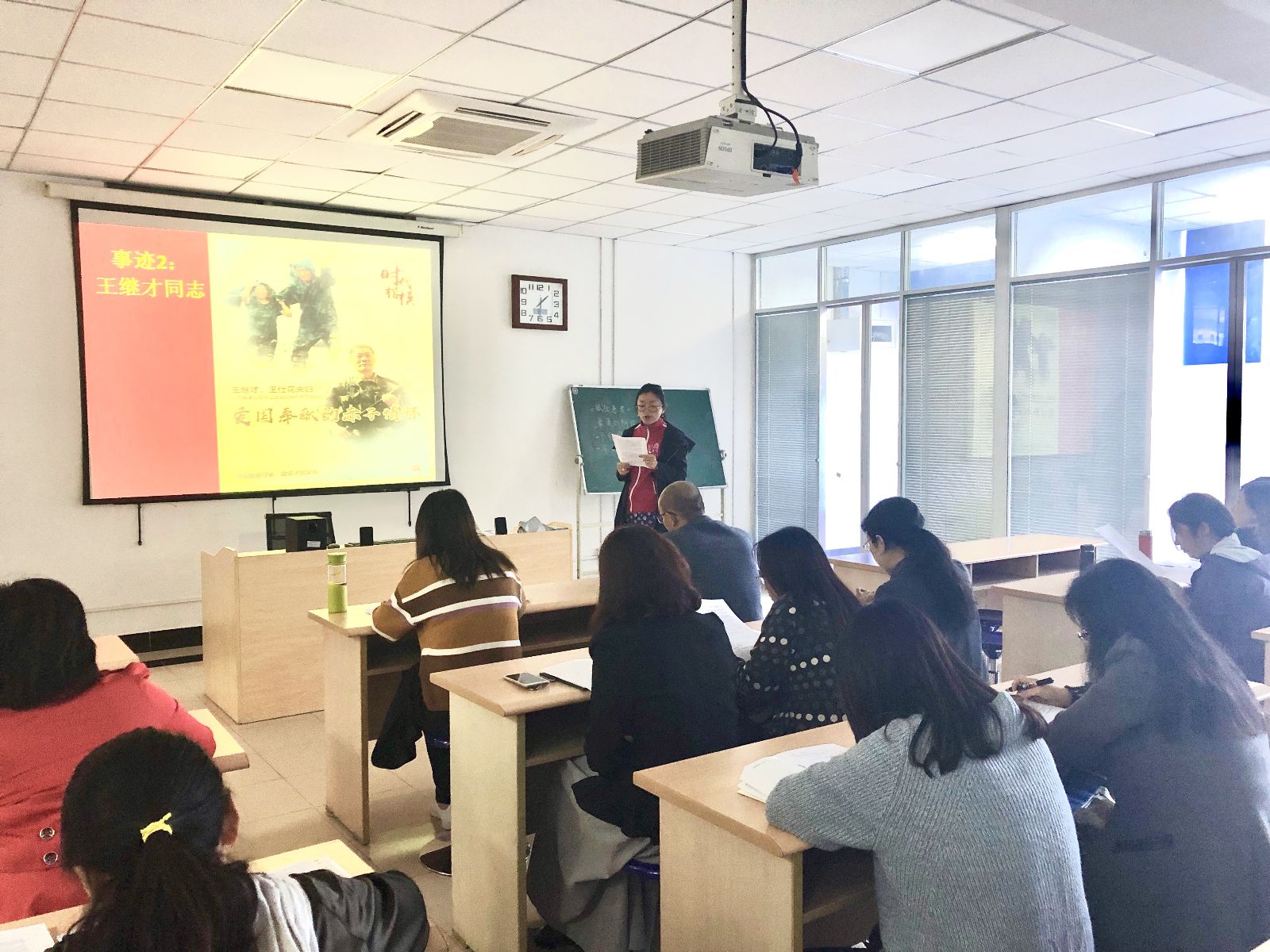 张媛同志首先向大家分发了学习资料,接着带领大家分别学习了黄群、宋月才、姜开斌、王继才同志的人物生平, 最后通过播放生动直观的视频,让党员教师深受感动与鼓舞。