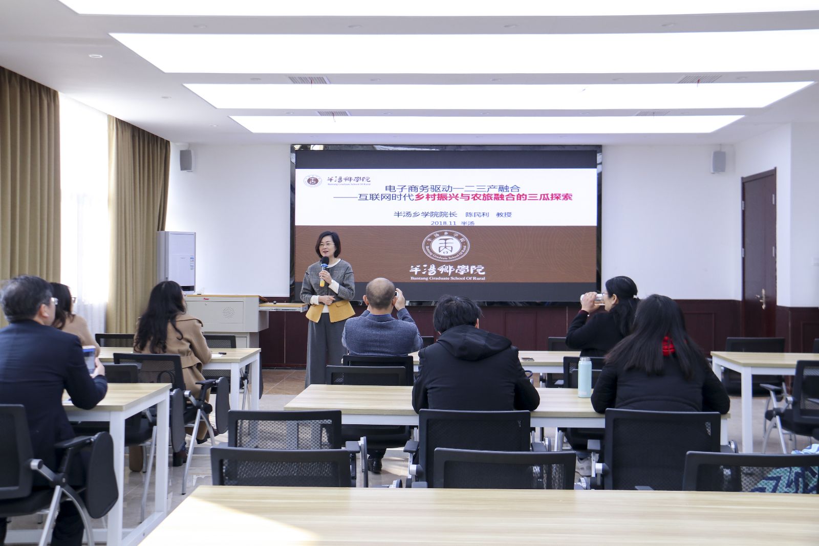 本次学习包括专家授课、参观考察、自由调研三部分。17日上午,专家授课由半汤乡学院院长陈民利教授主讲,题目为电子商务驱动一二三产融合—互联网时代乡村振兴与农旅融合的三瓜探索。陈教授从硬件建设、人的重塑和产业重塑三个方面详细介绍了三瓜公社项目。讲座后,教师们就三瓜公社的土地使用、电商运作、旅游业务等方面就行了深入交流。17日下午,八位教师在半汤乡学院于老师带领下参观了三瓜公社“冬瓜民俗村”、“ 南瓜电商村”。18日上午,八位教师根据专业教学领域分头开展调研。