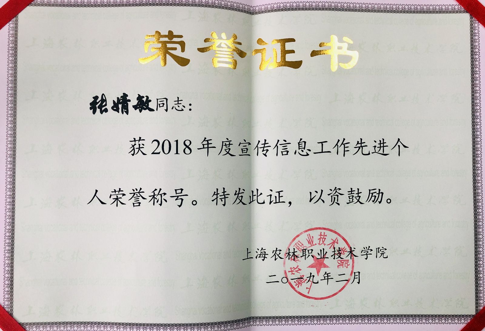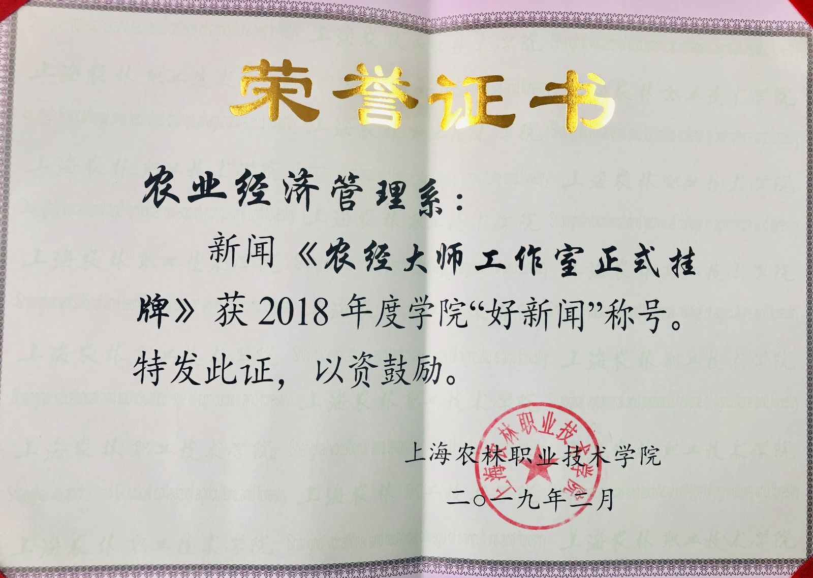 农业经济管理系荣获“2018年度学院好新闻”称号,张婧敏老师荣获“2018年度宣传信息工作先进个人”称号。
