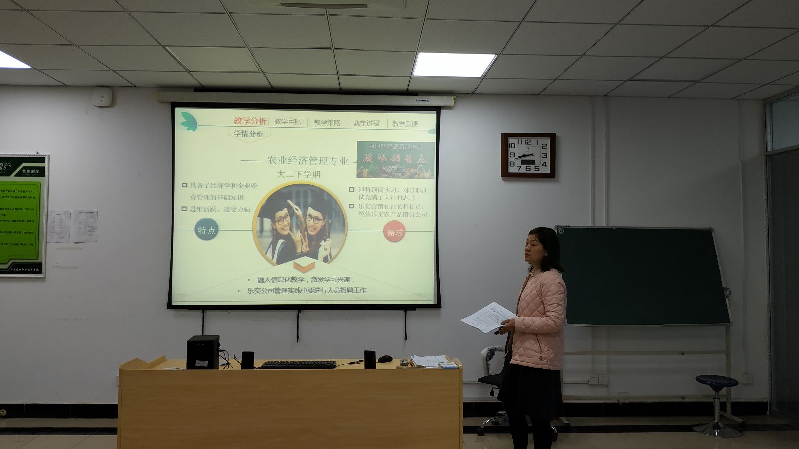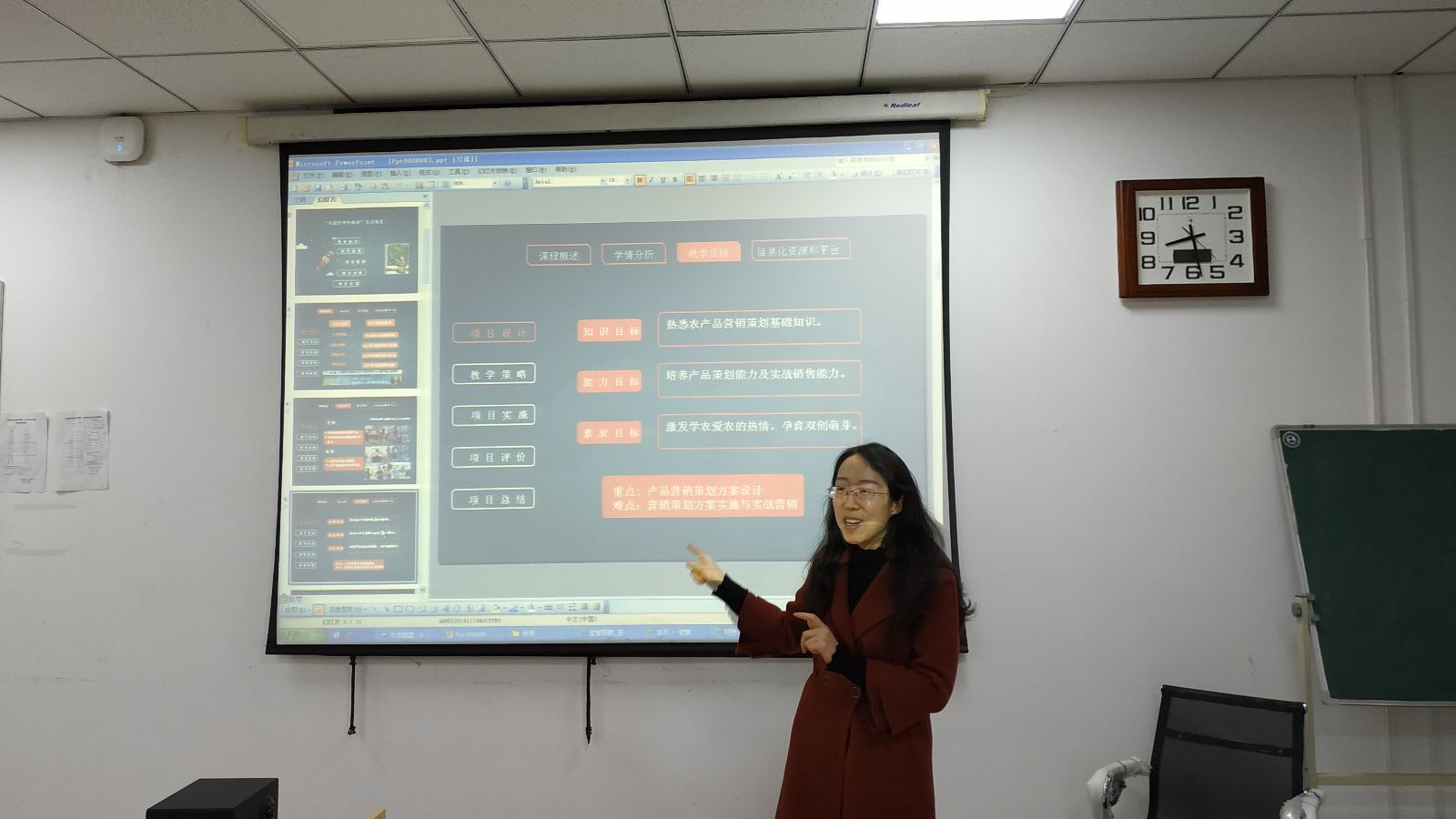 王海丽等四位教师分别按照大赛要求就自己的参赛项目开展汇报。王海丽老师汇报的是《实战营销争霸赛》教学设计,吴瑞芹老师汇报的是《SWOT分析》教学设计,蔡会敏老师汇报的是《旅游线路策划》教学设计,范丹老师汇报的是《面试礼仪与技巧》。四位教师准备都比较充分,PPT设计也特别精美,在项目过程组织、项目内容设计、信息化应用方面各有所长,在场教师对每一个项目进行了点评。