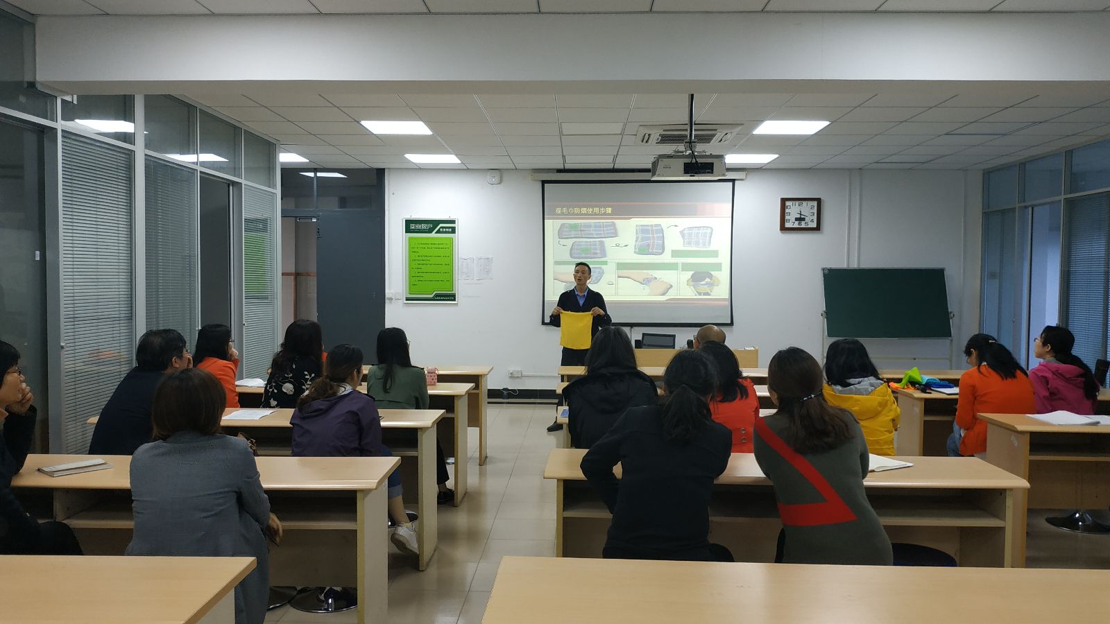 程教员结合近年来我国发生的几起重大火灾事故,通过视频和照片再现火灾发生后受困人员逃生情景,对老师们进行了逃生手段、逃生工具使用和防火设备设施的培训。在培训过程中,老师们不时在本子上记录相关知识或拿出手机拍照,反应积极。本次培训不仅让老师们更加了解消防安全知识,还向老师们传达了火警长鸣、生命脆弱、预防为主、科学防火的理念,增强了安全防范意识。