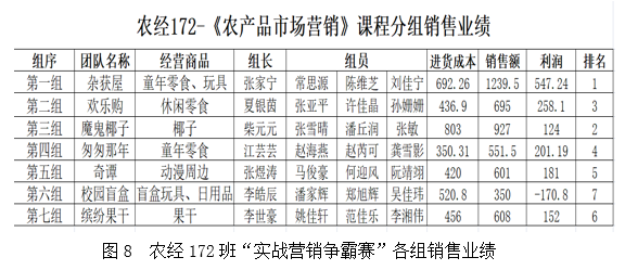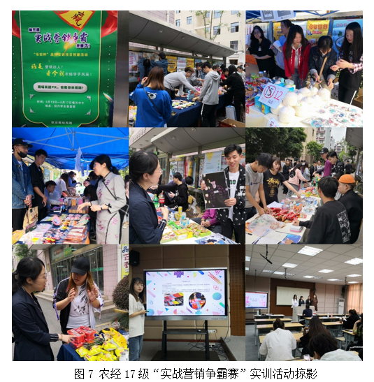 该实训项目结合课堂理论知识授课进度,从第4周开始启动,各组设计、修改调查问卷,然后展开市场调研和分析,确定各小组最终经营产品,第7周开始设计营销策划方案,第10周完成海报设计,12周完成微视频的设计,第13、14周在线上和线下开展实战销售,第15周完成实训汇报答辩,两个班级一共13个团队完成了该实训活动(见下图7)。