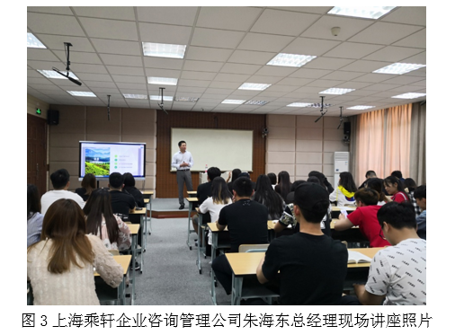 其次,在本学期实训活动开展中,加强了对各组学生的实战营销指导。一方面,在实战销售环节,邀请了校外企业专家——上海乘轩企业咨询管理公司的朱海东总经理为农经17级学生做了一场关于“农产品营销的互联网矩阵”的讲座(见下图3),指导学生如何在互联网时代展开实战营销。另一方面,在5月30日的实训汇报环节,邀请了上海铂士顿科技公司陈忠宇总经理担任评委老师,针对各组实训项目完成情况提出针对性的问题以及完善建议(见下图4),提高了学生理论联系实践解决问题的能力。