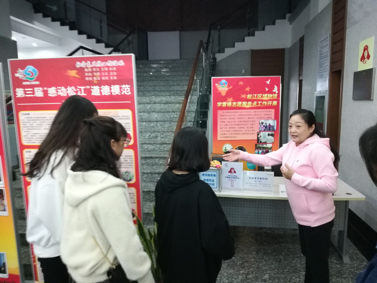 会后一行人参观了松江博物馆,开发教育部朱老师为团员学生代表展示了博物馆学雷锋志愿服务点的情况,并针对馆藏进行了生动精彩的讲解。