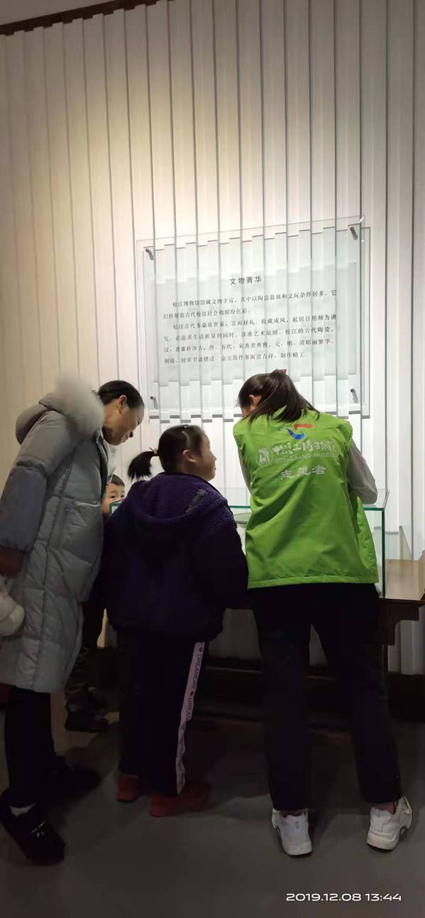 不忘初心使命,志愿者们践行岗位职责,耐心为游客讲解松江的历史文化故事。《流沙沉宝》主题展,展出了四个古文化在松江先民早期的社会生活,以及近半个世纪以来松江地区的文物和经济的繁荣发达。松江区博物馆作为爱国主义教育基地,在增强文化自信等方面起到积极的作用,志愿者在服务的同时也对松江文化有了深层次理解和感悟。