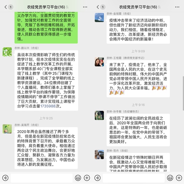 农经系老党员金旭霞老师表示,当前处于全球抗“疫”的时间节点,疫情冲击带来了经济活动的中断,但也提升了新经济迈向崭新阶段的动力,我们相信,随着疫情稳定、政策发力、改革提速,新经济势必会揭开中国经济的新篇章!走好防控疫情和稳经济的“平衡木”,用我们的“中国方案”和“中国力量”在经济全球化的历史进程中为世界经济的增长、商品和资本的流动、科技和文明的进步中做出贡献。