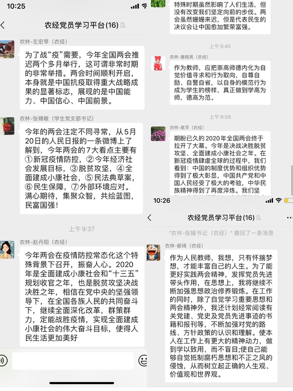 青年党员赵丹阳老师表示,今年两会在疫情防控常态化这个特殊背景下召开,振奋人心。2020年是全面建成小康社会和“十三五”规划收官之年,也是脱贫攻坚决战决胜之年,相信在党中央的坚强领导下,在全国各族人民的共同奋斗下,继续全面深化改革,群策群力,定能战胜疫情,实现全面建成小康社会的伟大奋斗目标,使得人民生活更加美好。