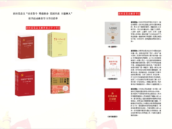 农经系党总支根据活动方案安排,积极着手开展工作,共同推出了四本重点学习书目。各位党员同志在收到活动通知后,也积极响应,分别推荐出一本好书,并附上了推荐理由。