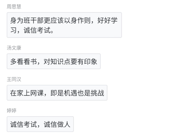 其他同学也纷纷表示,作为学生干部要担负起带头、引领、模范作用,做好表率,营造良好的学习氛围,并充分激发和调动班级同学学习自主性,促进良好学风的形成。