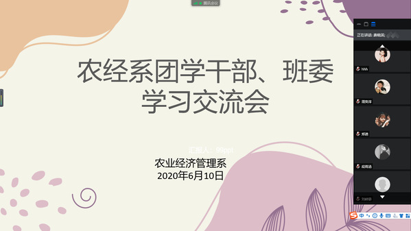 6月11日中午11:20,农经系借助腾讯会议,组织系部团学干部开展学风建设研讨会。本次研讨会旨在进一步推进农经系学风建设,为学生成长营造健康良好的学习氛围。农经系主要团学干部参与本次研讨会,会议由农经系团总支书记唐晓英老师主持。