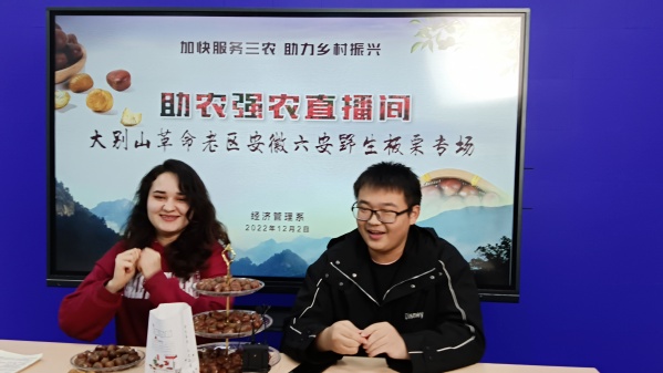 为践行服务“三农”的使命,彰显助力乡村振兴的担当,12月2日下午,经管系“助农强农直播间”正式开播,本次直播间宣传展示的农产品是来自安徽六安的板栗,由新媒体营销社团推荐的四位同学担任主播。